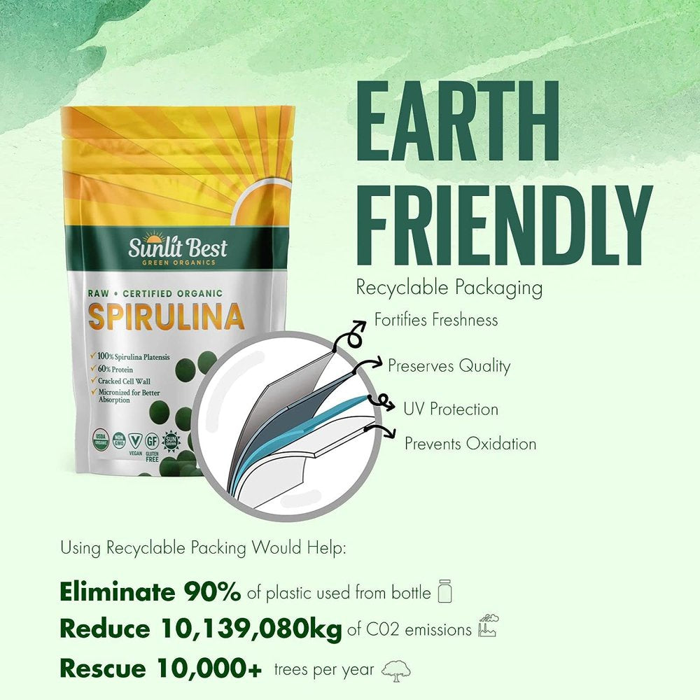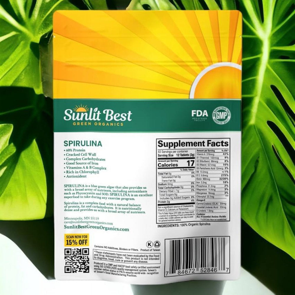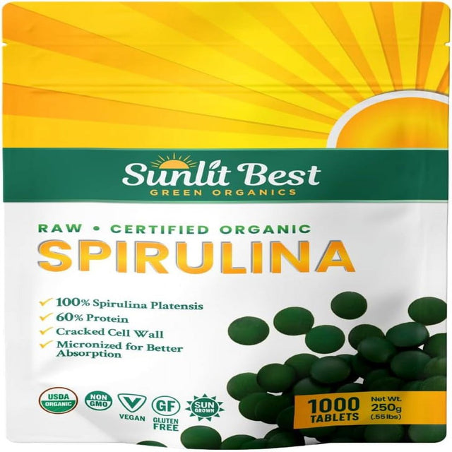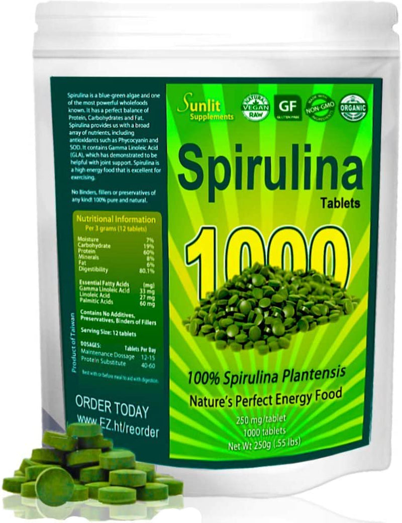ORGANIC SUPERFOOD FOR OPTIMAL HEALTH: Our potent natural superfood Spirulina supplements nourish your cells to help boost energy levels, support a strong immune system, detoxify your body, reduce inflammation, improve digestion & support gut health. Sunlit Best Green Organics Spirulina tablets are an integral part of your natural beauty regime & overall healthy, energetic lifestyle.,IMMUNE SUPPORT & ANTIOXIDANT: Unlike other green powder products, our Organic Spirulina Tablets are loaded with potent antioxidants and nutrient-rich chlorophyll that naturally strengthen your immune system by protecting cells from oxidative damage and chronic inflammation while also helping your body naturally cleanse itself of toxins. Our Spirulina supplements support good health and vitality at the cellular level and give your body exactly what it needs to thrive!,IMPROVE MUSCLE STRENGTH & ENDURANCE: The powerful nutrition, high protein, blue green a ae found in our raw, organic Spirulina supplement has been shown to increase muscle strength, boost stamina, and reduce recovery time after training. Optimize your fitness level with our ultra-pure spirulina tablets! Third-party tested for quality and purity. Non-GMO, Gluten-Free, NO additives, NO fillers, NO preservatives, NO binders, and NO artificial colors.,BOOST YOUR ENERGY LEVELS NATURALLY: Sunlit Best Green Organics superfood Spirulina Tablets are made up of 60% pure vegan protein and the perfect balance of essential nutrients, including chlorophyll, fiber, antioxidants, enzymes, potassium, iron, calcium, nucleic acid, vitamins A, B1, B2, B6, B12, C, E & minerals along with 18 amino acids proven to boost energy levels, reduce fatigue, and speed up recovery! Better than any sugary greens powder energy drink!,EASY TO SWALLOW: Our Superfood Spirulina Tablets are easy to swallow and digest. Each tablet is made of raw and pure Spirulina (Platensis) which is micronized for faster and better absorption. They are smaller supplements than spirulina capsules, and there is no need to mix in a high-sugar green juice powder or shake to hide the taste as you do with spirulina powder & chlorella powder. Each tab is 250 mg with 1000 tablets per travel size MEGA PACK bag.,COUNTRY OF ORIGIN: Our Sunlit Best Green Organics products are USDA Certified Organic, Vegan & Cruelty-free that made of 100% sun-grown and cultivated micro-a ae health food sourced from Taiwan. NOT MADE IN CHINA - but most other brands are!