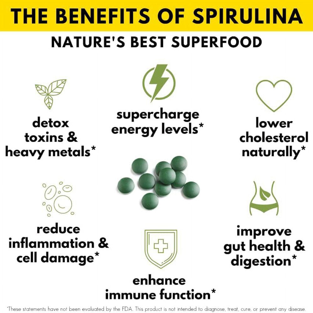 Spirulina Tablets (Mega-Pack 1000 Tablets). Organic, raw, Non-GMO. 100% Pure Green Superfood Spirulina Plantensis Supplement. Maximum Protein and Chlorophyll. No preservatives or fillers. Spirulina is often deemed the most nutritionally complete of all food supplements, containing protein, complex carbohydrates, iron, and vitamins A, K, and B complex. It is also rich in chlorophyll, fatty & nucleic acids, and lipids. Minerals: Packed with highly beneficial magnesium, PLUS minerals like potassium, iron and calcium. Amino Acids: A rich source of protein with a balance of important amino acids, including all of the essential ones which the body can't manufacture. Chlorophyll: Super rich in Chlorophyll. Energy: Feel better. Power your life with a true superfood.