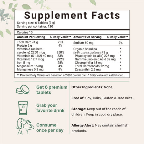Certified Organic Spirulina, USP Verified, USDA Organic, Non-Gmo, 500 Mg, 720 Vegetarian Tablets