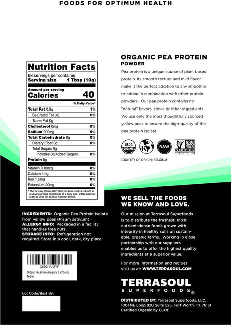 Terrasoul Superfoods Organic Pea Protein, 1.5 Lbs - European Sourced | Unflavored | Smooth Texture