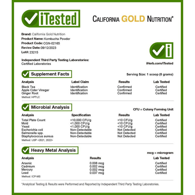California Gold Nutrition SUPERFOODS Kombucha Powder, Ginger Lemon Fermented from Small-Leaf Black Tea from Taiwan Great Addition to a Healthy and Active Lifestyle Supports Digestive Health* Infused with Ginger Root and Lemon Extract for a Refreshing Flavor Suitable for Vegetarians and Vegans Formulated without Gluten, GMOs, or Soy Produced in a 3rd Party Audited cGMP Registered (Certified) Facility 100% Gold Guarantee Your diet is an important part of a healthy lifestyle. If you’re looking to add more healthy options into your routine, a superfood drink, like kombucha, can be a great addition, as it can help support digestive health.* California Gold Nutrition SUPERFOODS Kombucha Powder is a convenient powder that allows you to create a nutritious drink whenever you’re craving something healthy. Kombucha Benefits Kombucha is a drink made from fermented tea leaves that is known for its potential health benefits. Our kombucha powder is fermented using a proprietary symbiotic culture of bacteria and yeast (SCOBY), which makes it a good way to add more probiotics, or good bacteria, into your diet. These good bacteria can support digestive health by helping to keep your body’s microbiome balanced.* California Gold Nutrition SUPERFOODS Kombucha Powder is made with hand-picked, small-leaf black tea from high in Taiwan’s Alishan mountains. It then undergoes our fermentation process to produce a premium-quality kombucha, which is spray dried and microencapsulated to preserve the flavor and nutritional value. Simply add this ginger-lemon flavored powder to water to create a refreshing and beneficial kombucha drink. iTested Verified