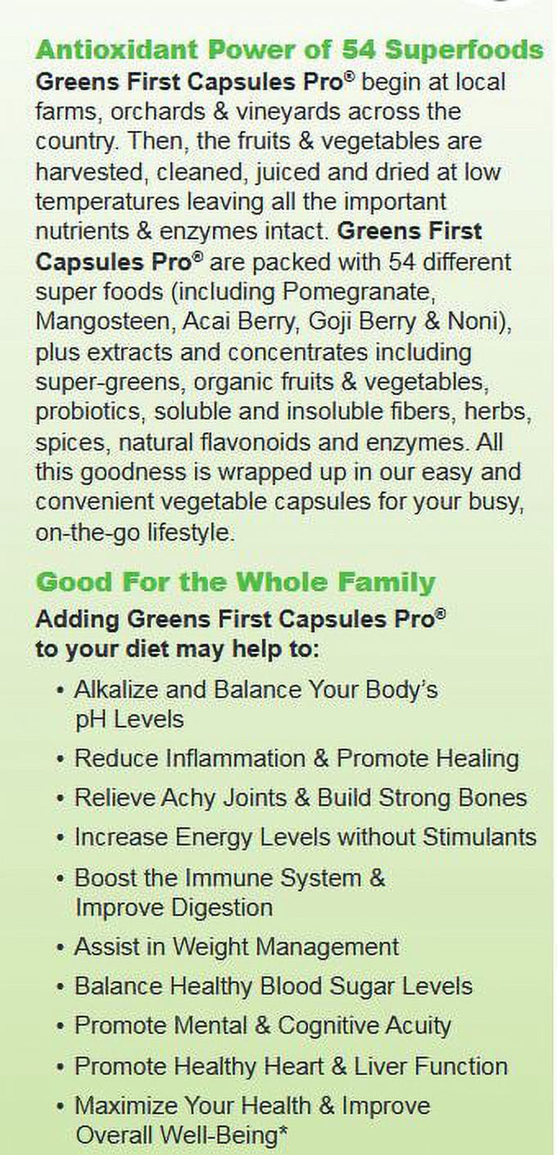 Greens First Pro-Capsules - 30 Servings - 54 Nutrient Rich-Antioxidant Superfoods, Organic Fruits & Vegetables, Dairy and Wheat Free, Non-Gmo - 180 Capsules