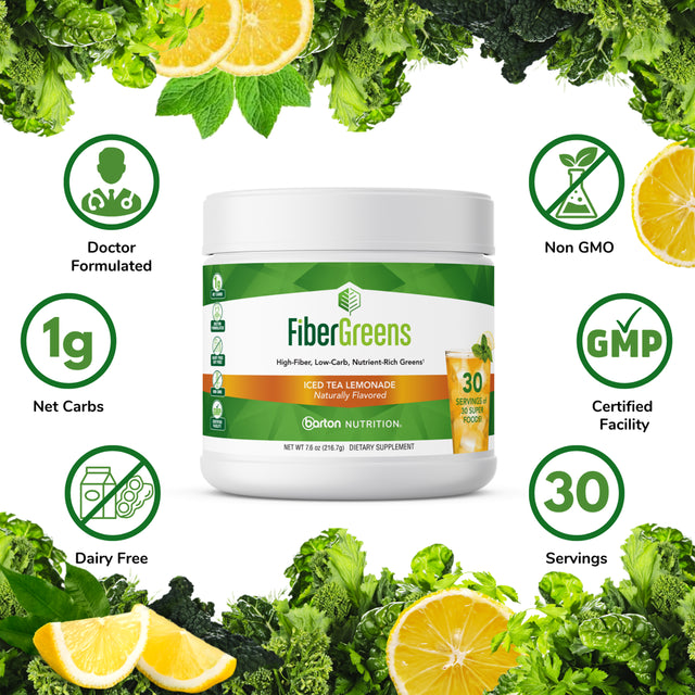 Iced Tea Lemonade Fiber Greens - Low-Carb Probiotics for Gut Health - Blood Function Support - Naturally Flavored Probiotic Formula with 30 Superfoods - Protects Heart Health, 30 Servings