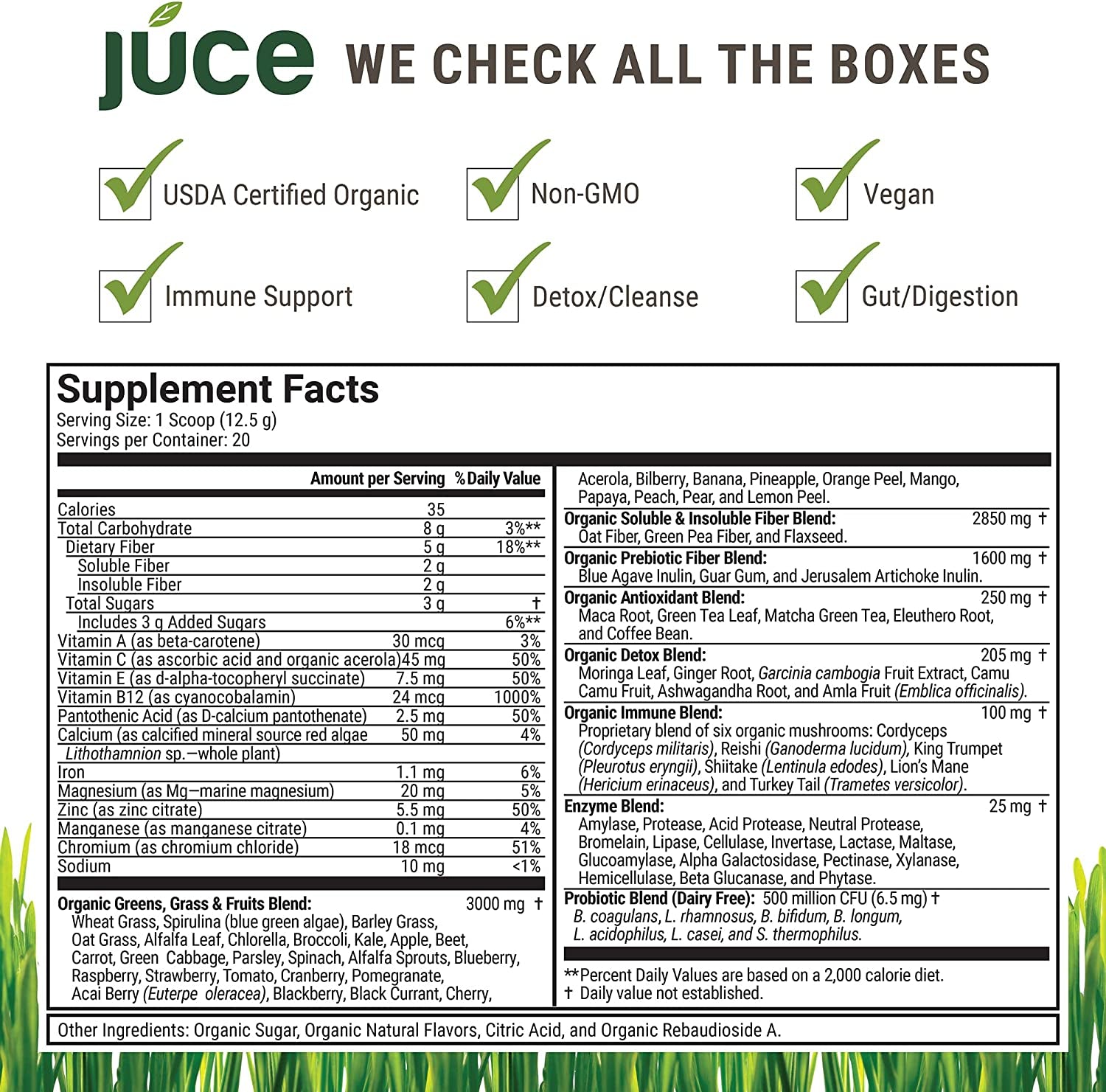 - PURE & DELICIOUS : Our greens and superfoods blend is USDA Certified Organic, Vegan, & Non GMO and contains no Dairy, Soy, Gluten, Gelatin, or Artificial Ingredients. It's bursting with apple flavor and blends easily into juices, smoothies, and protein shakes.