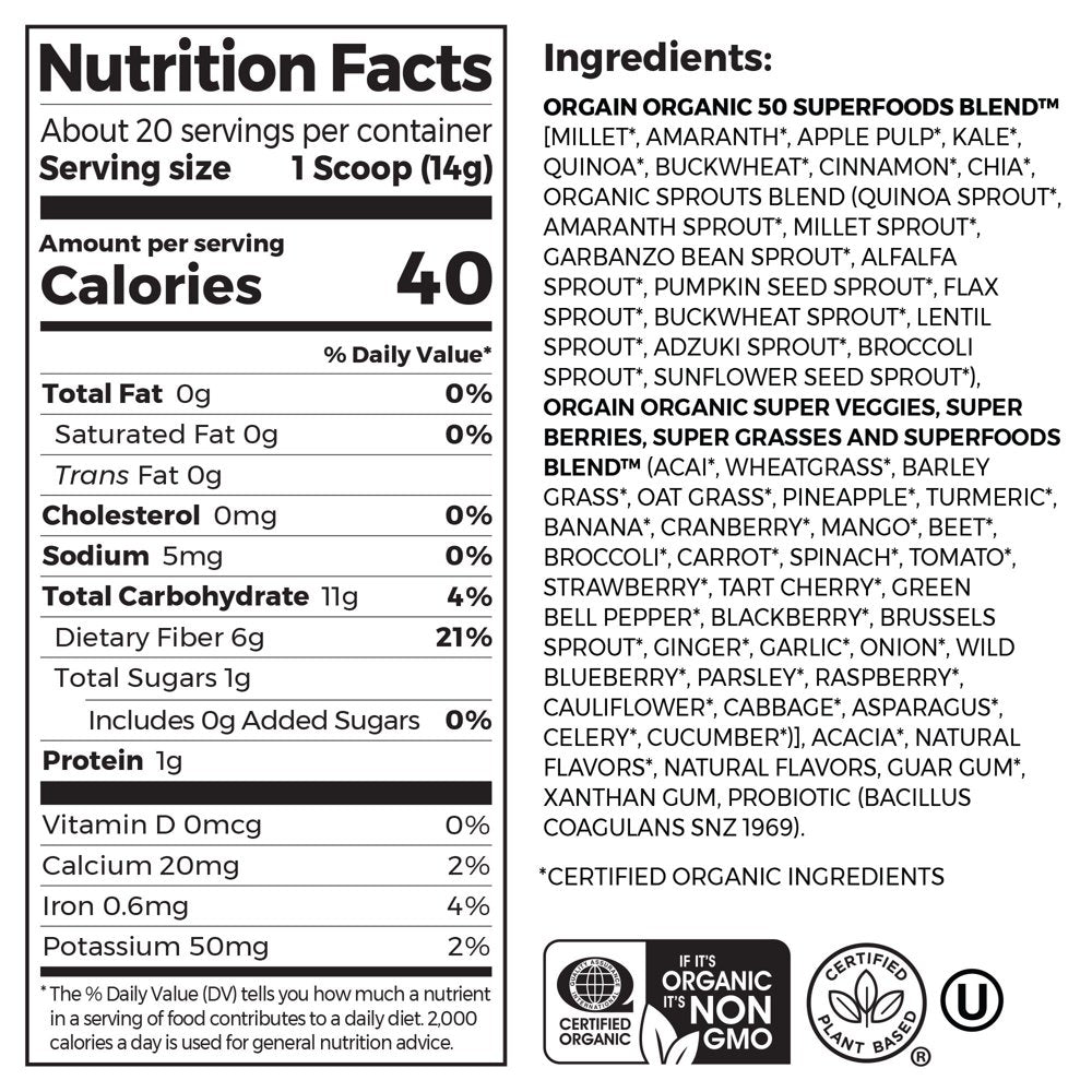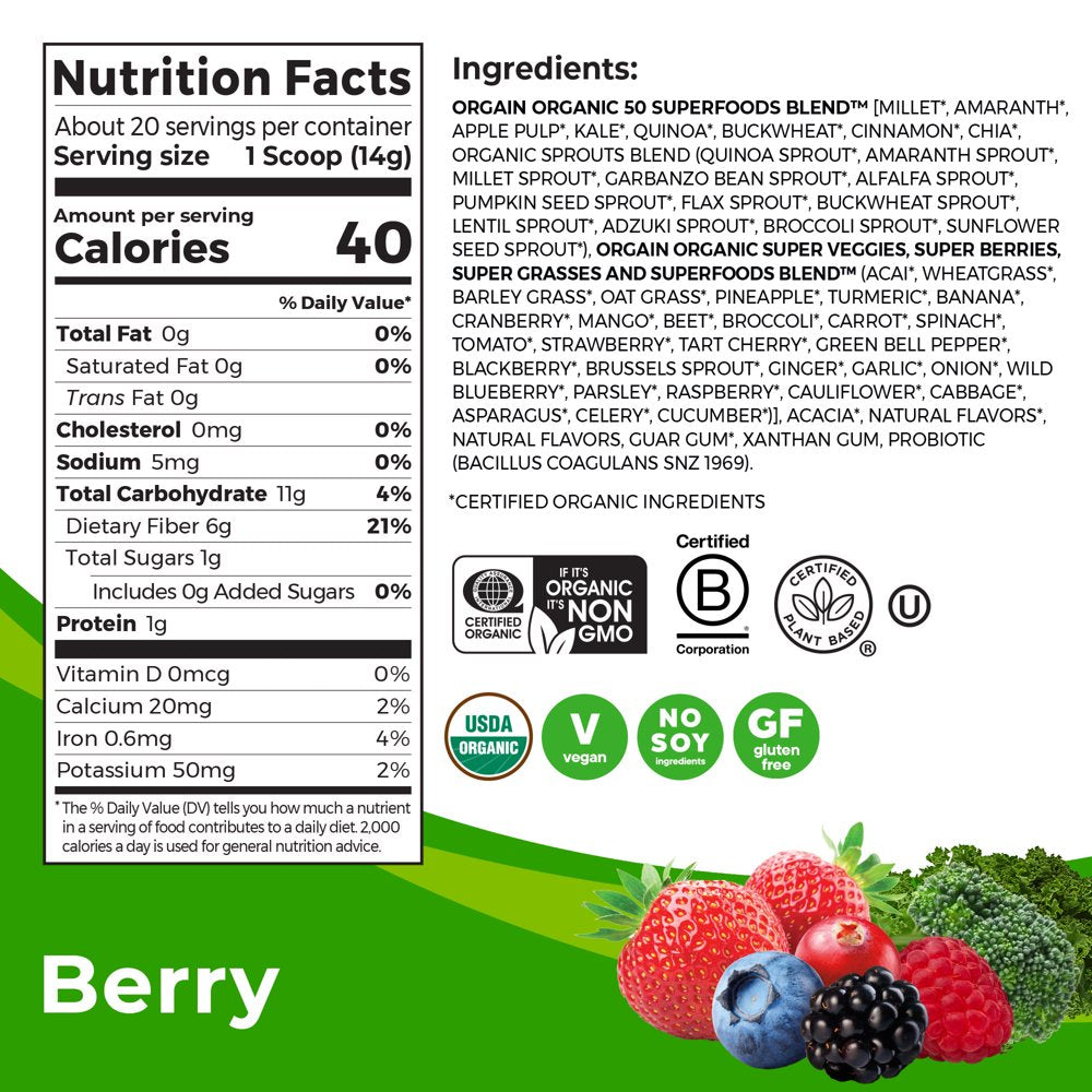 - CLEANER INGREDIENTS: Our Organic Superfoods Powder is packed with nutrients from 50 plant-based superfood ingredients such as organic ancient grains, berries, fruits, greens, grasses, veggies, herbs and sprouts. It also features 1 billion probiotics per serving to support gut health!