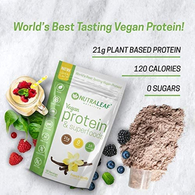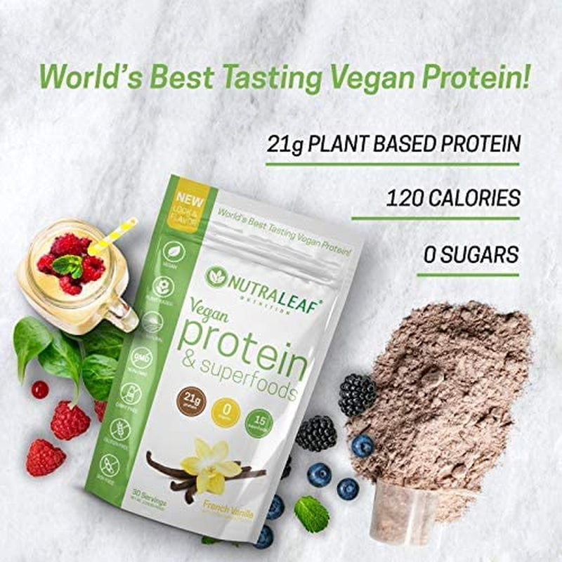 - π ALL OF THE GOOD STUFF AND NONE OF THE BAD! The best and most complete vegan protein on the market! Each flavor of NutraLeaf Protein and Superfoods is packed with the nutrients your body needs to stay healthy, energized and strong. With 21 grams of plant-based protein per serving and only 120 calories, our unique formula has everything you need to help meet your fitness and nutrition goals.