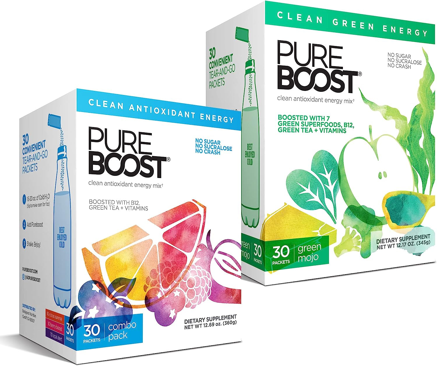 Pureboost Clean Energy and Superfoods Bundle. 60 Stick Packs Boosted with B12, Vitamin C and More. Fruity Combo Pack + Green Mojo Includes 7 Organic Supergreens.