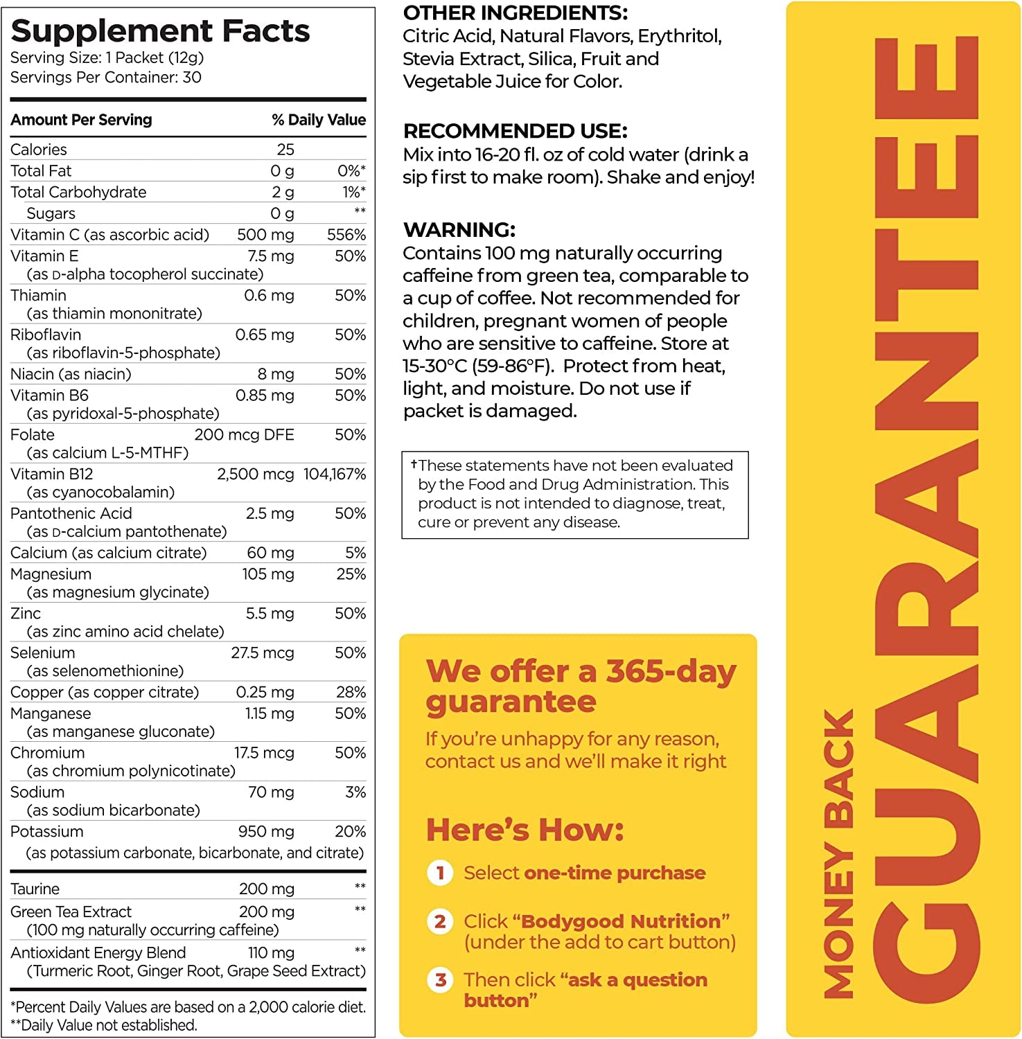 • Guilt free energy with B12 + natural green tea. Powerful, clean energy fueled by B12 and 100 mg of natural green tea caffeine. Never feel those jitters that you have to cope with from other dirty energy sources.