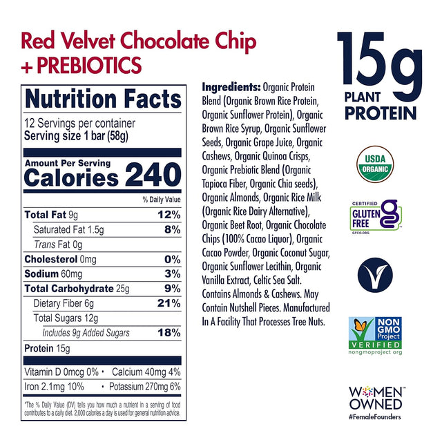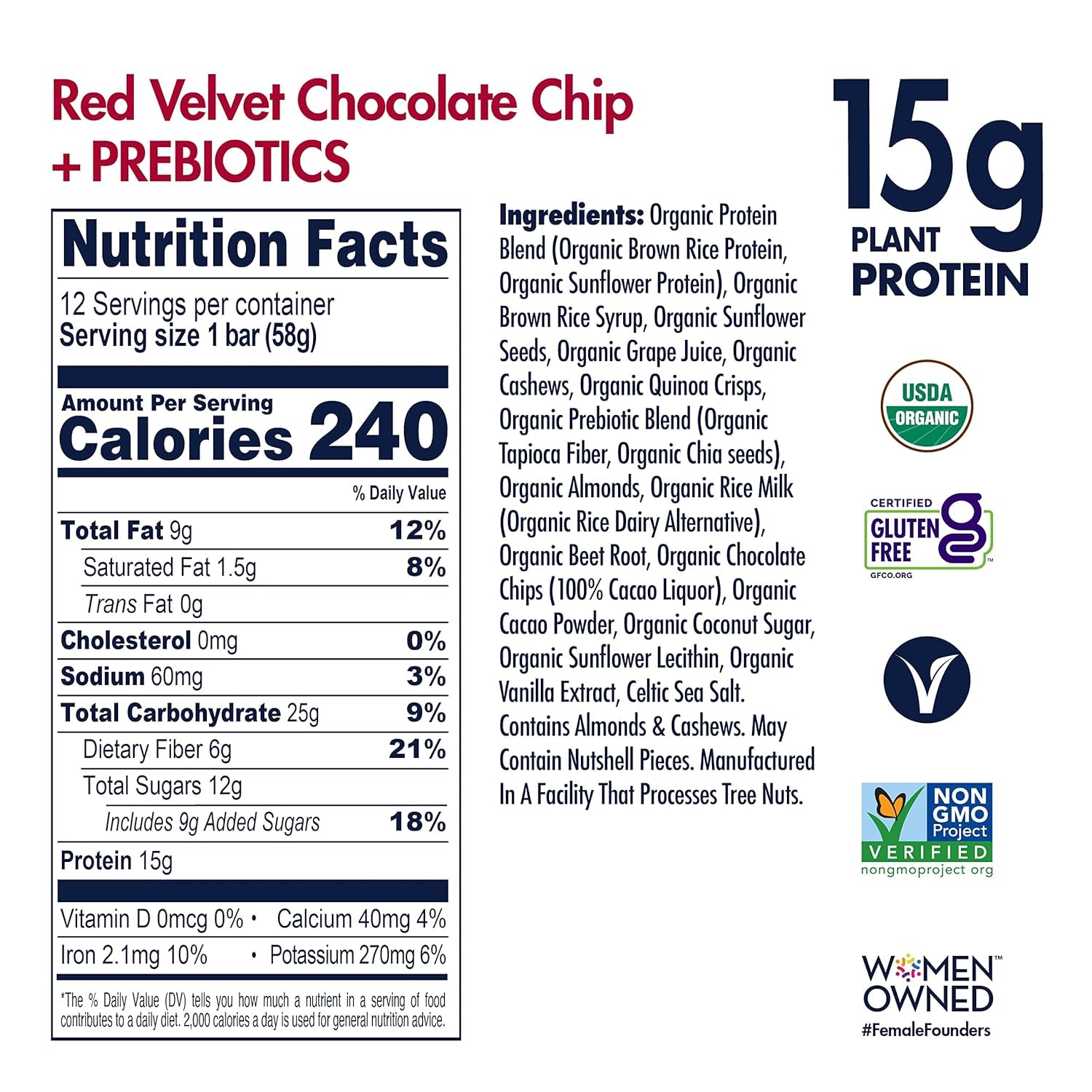 - What? Full bodied Chocolate notes, Delightful texture, Sweet Cashew Cream. Have your cake and eat it too. Red Velvet Chocolate Chip + Prebiotics is soft and chewy with whole food inclusions like Almonds and Cashews for an irresistible chew you are going to want to seek your teeth into.