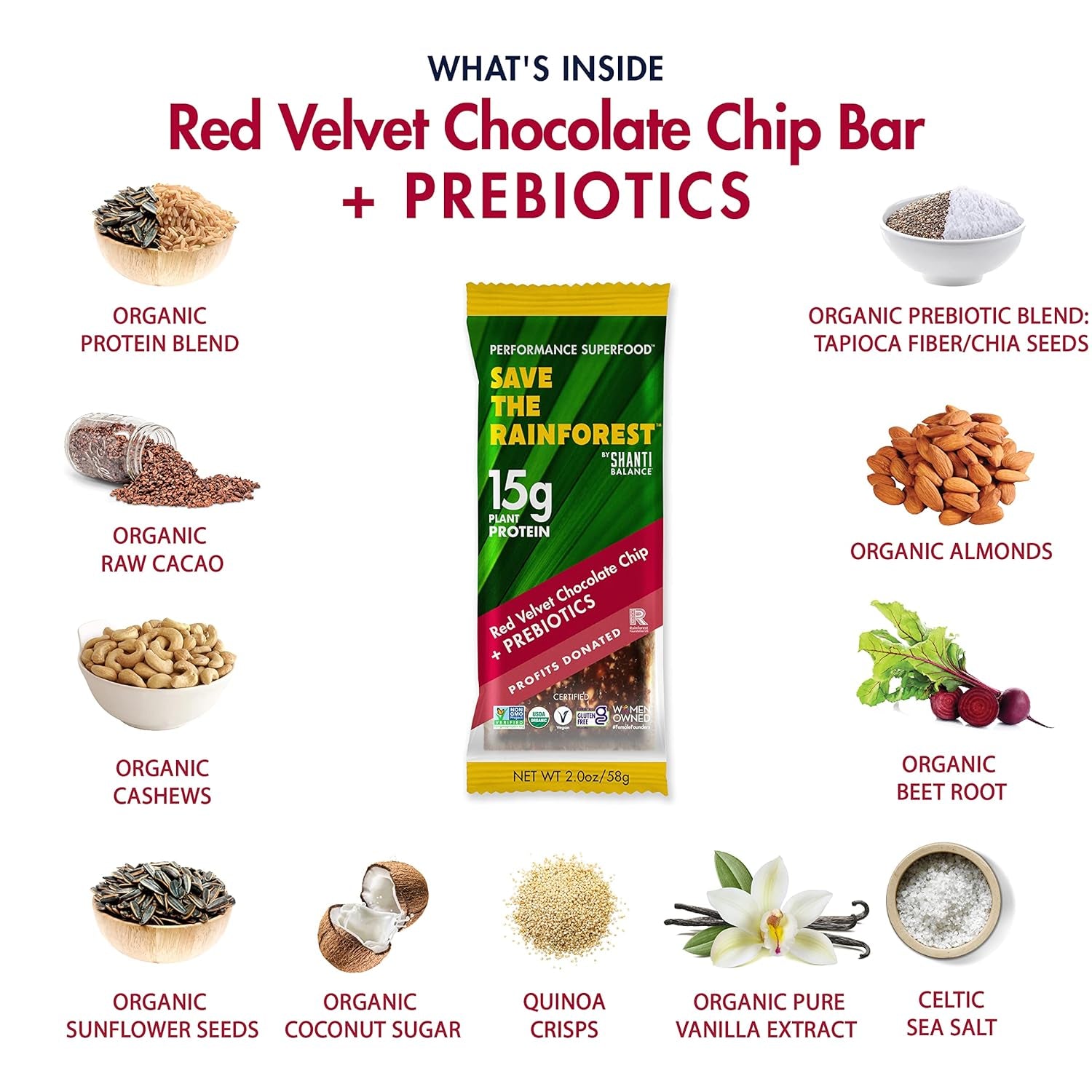 SHANTI BAR Plant Protein + Immunity Superfoods, Prebiotics | Vegan, Gluten Free, Paleo, Raw Healthy Snack, Certified Organic, Low Glycemic, No Refined Sugars | Red Velvet Chocolate Chip | 12 Count