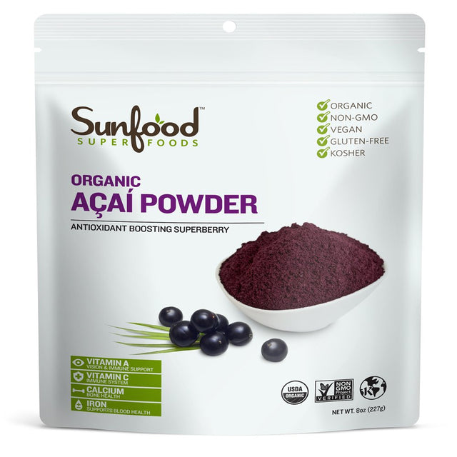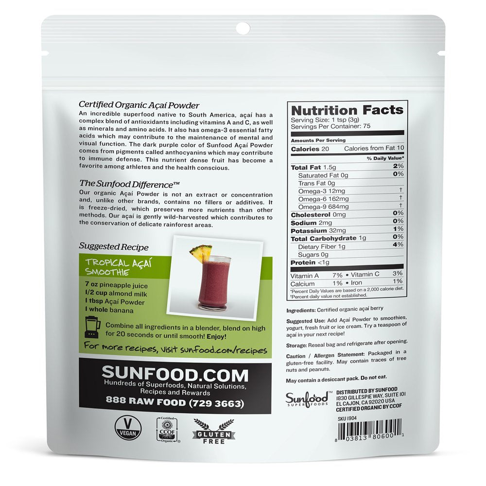 Certified Organic Açaí Powder An incredible superfood native to South America, açaí has a complex blend of antioxidants including vitamins A and C, as well as minerals and amino acids. It also has omega-3 essential fatty acids which may contribute to the maintenance of mental and visual function. The dark purple color of Sunfood açaí comes from pigments called anthocyanins which may contribute to antioxidant defense support. This nutrient dense fruit has become a favorite among athletes and the health conscious. The Sunfood Difference™ Our organic açaí powder is not an extract or concentrate, and unlike other brands, it contains no fillers or additives. It is freeze-dried, which preserves more nutrients than other methods. Our açaí is gently wild-harvested, which contributes to the conservation of delicate rainforest areas.
