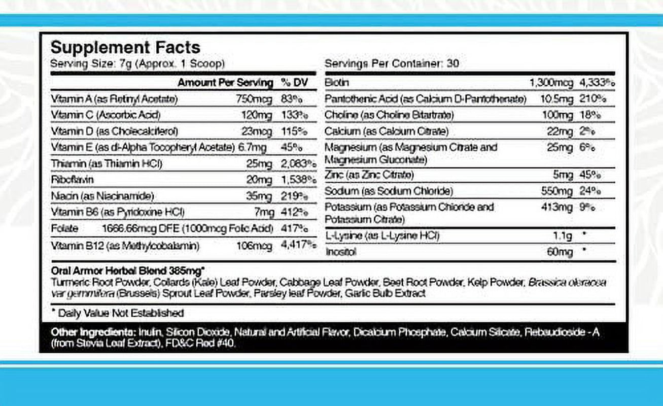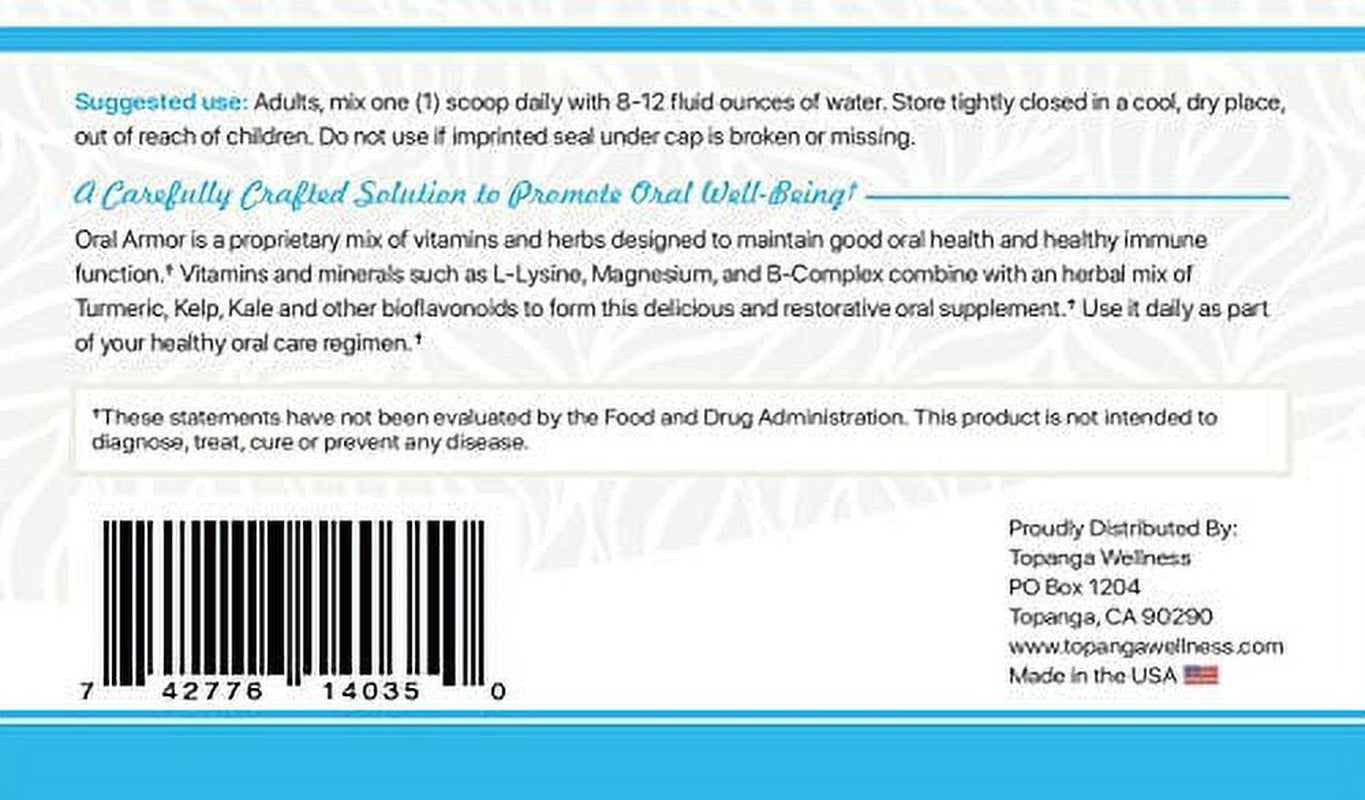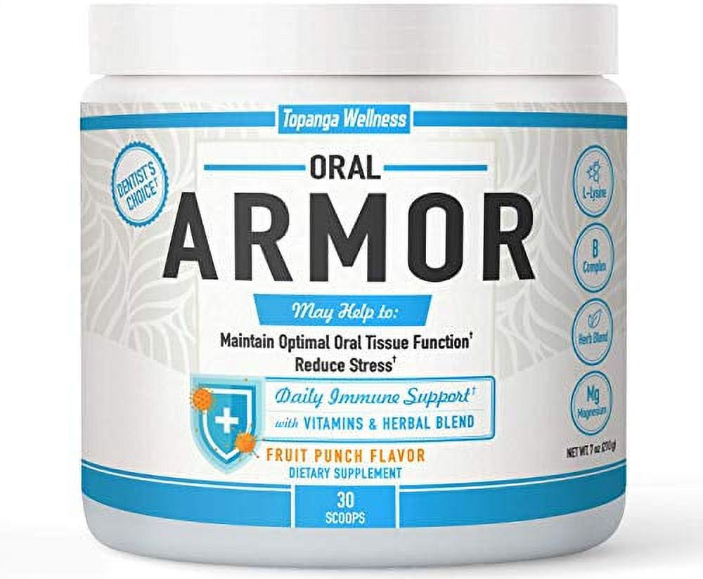 WE ARE BACK IN STOCK! Are you looking for the best way to Boost your Immune System and Strengthen your Mouth Tissues? Oral Armor is an easy to ingest Powder that Mixes with Water to create a Sweet-Tasting & Restorative Fruit Punch Drink. Try this proprietary mix of vitamins and herbs designed to maintain good oral health and healthy immune function. Vitamins and minerals such as L-Lysine, Magnesium and B-Complex combine with an herbal mix of Turmeric, Kelp, Kale and other bioflavonoids to form this delicious and restorative herbal supplement. Use it daily as part of your healthy oral care regimen.