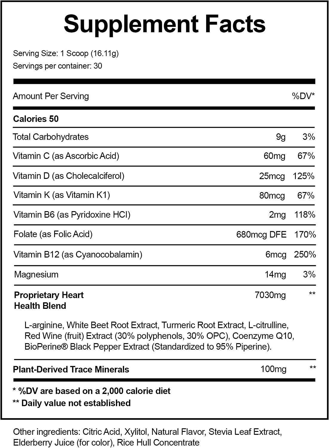 - L-arginine, BeetRoot Powder, L-citrulline, Turmeric, CoQ10, Vitamin C, Vitamin D, Vitamin K, Vitmain B6, Folic Acid, Magnesium, Red Wine Extract, BioPerine
