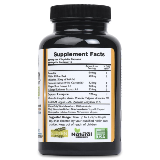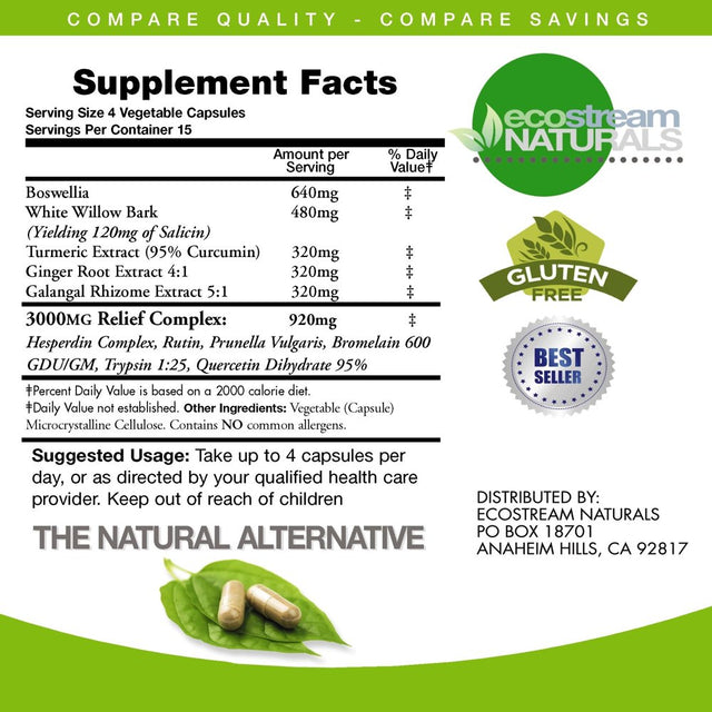 Soothing reactions come from with Ecostream Naturals All Natural Inflam Assist Ease Turmeric Curcumin Plus Maximum Support 3000 mg Gluten Free 60 Count Supplement Pills. Formulated with turmeric curcumin and Boswellia, it also contains ginger, white willow bark, galangal rhizome extract, botanicals and enzymes. This natural dietary supplement is free of any fillers. The gluten-free supplement offers a natural alternative. Take these turmeric curcumin capsules as part of your daily routine. Four capsules make up one serving size totaling 3000mg, which is the recommended daily amount. Consult with your doctor to meet your specific requirements. Safe and effective, the natural dietary supplement is suitable for day or night. It comes with 60 capsules per bottle, so you have enough to last for weeks. To experience optimal benefit from this Turmeric supplement, incorporate exercise, rest and follow a healthy diet. This product is a suitable choice for vegetarians. 'Turmeric-Curcumin', and 'Unisex'. Ecostream Naturals All Natural Inflam Assist Ease Turmeric Curcumin Plus Maximum Support 3000 mg Gluten Free 60 Count Supplement Pills