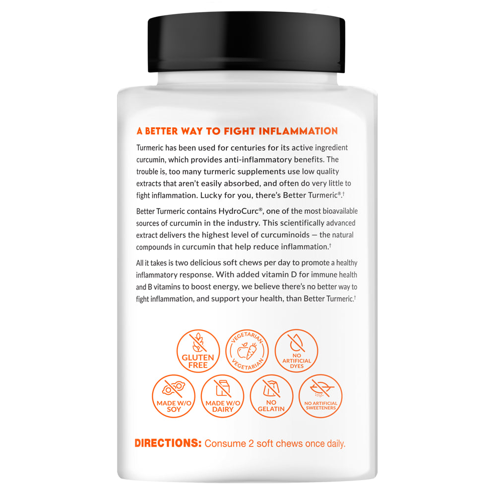 All it takes is two delicious soft chews per day to promote a healthy inflammatory response. With added vitamin D for immune support, and a potent dose of B vitamins to boost energy, we believe there’s no better way to fight inflammation and support your health than Better Turmeric™.