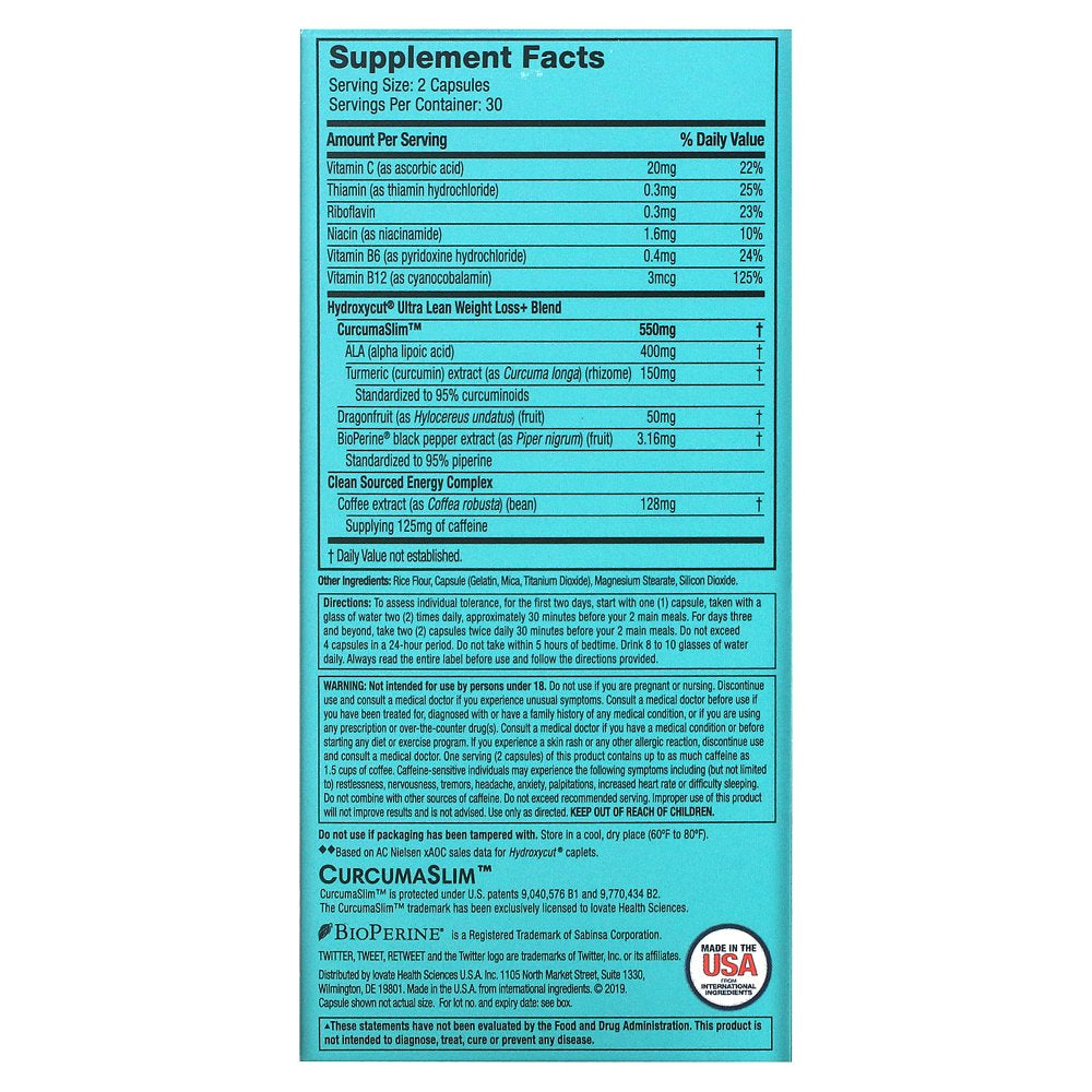 Hydroxycut Ultra Lean brings together two key ingredients in an effective, scientifically researched weight loss combination that supports your healthy weight loss plan, which includes diet and exercise. The Hydroxycut research and development team have developed this unique, synergistic ingredient combination for weight loss, protected by two U.S. patents. CurcumaSlim is a combination of two ingredients: pure turmeric/curcumin that provides 95% curcuminoids and alpha lipoic acid (ALA), a compound found naturally in the body that helps turn glucose into energy. Two scientific studies support the weight loss results from CurcumaSlim. In two 16-weeks studies, subjects using the key ingredient combination (alpha lipoic acid and curcumin) lost an average of 12.56 lbs. vs. 6.12 lbs. for placebo and 4.84 lbs. vs. 0.87 lbs. for placebo, respectively. All subjects followed a calorie-reduced diet and walking programs. Formulated with powerful metabolism boost from Coffea robusta, a clean source of energy and the antioxidant vitamin C and B vitamins that help to metabolize carbs, proteins and fats. Coffee extract is included to provide a clean source of energy. Contains caffeine to boost metabolism and increase energy. Hydroxycut wants to help you reach your goals and maintain your commitment to a healthy, active lifestyle. 30 servings per container.