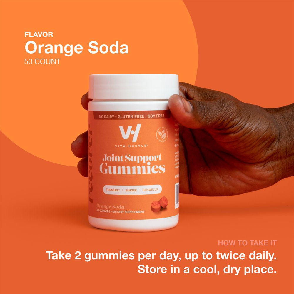 VitaHustle Joint Support Gummies by Kevin Hart promote healthy joints and muscle function. Packed with Turmeric, Ginger, and Boswellia to support joint flexibility, healthy inflammation response, and overall muscle and joint health. These gummies contain 150 mg of Turmeric extract with black pepper for bioavailability, 25 mg of ginger and 10 mg of Boswellia. Additionally, this gummy provides antioxidant protection to help your body fight off harmful toxins. Simply chew 2 gummies daily for best results. Vegan, gluten-free, low sugar, soy-free, low carb, dairy-free. results.
