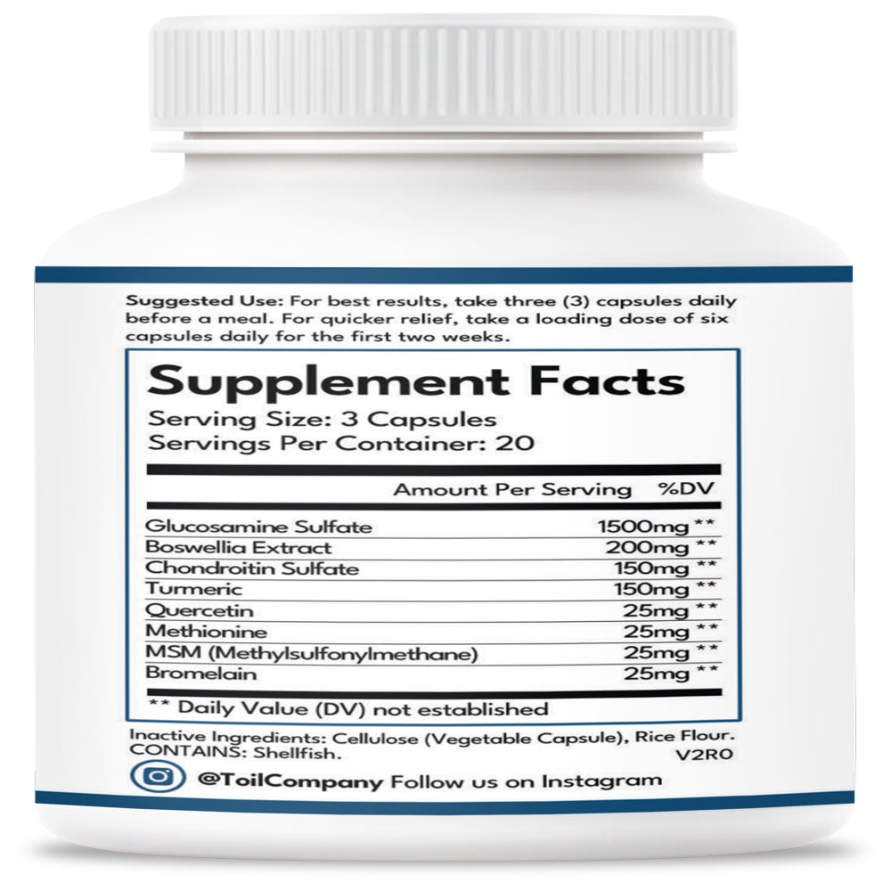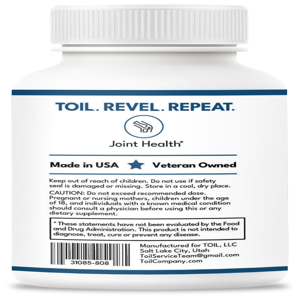 Why You Care - Helps decrease inflammation and joint discomfort, increases joint mobility Because your joints need you . . . and you need your joints. Glucosamine Sulfate leads the way in our powerful joint support blend that includes Boswellia, Chondroitin, MSM, Turmeric, Quercetin, Methionine, and Bromelain. These ingredients work synergistically to decrease joint discomfort and inflammation, and increase mobility. Like all the rest of our supplements, the Toil team uses Mobility Plus, too. We're a Utah based, veteran owned company who believes in working hard and playing harder -- that's why our mantra is TOIL. REVEL. REPEAT.