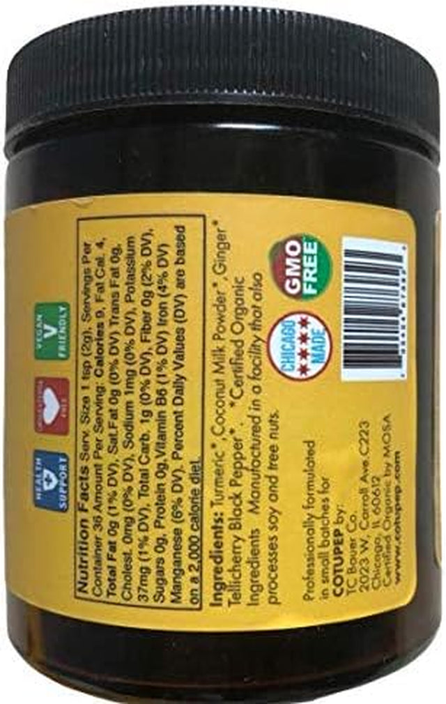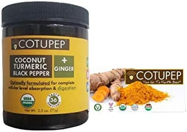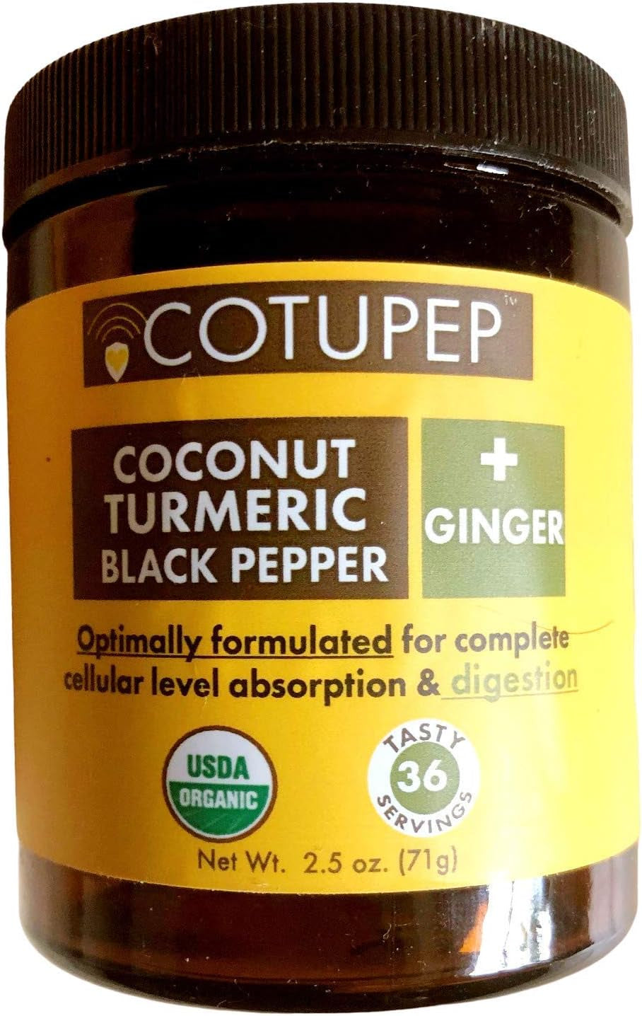 COTUPEP offered with an extra pep! Natural ginger added to sublimate your experience. Perfect blend to boost digestion, metabolism and improve uptake of other food nutrienets.. Contains the purest certified organic turmeric, coconut milk, black pepper and ginger root - in a perfect blend to help your revitalize your body. Get the power of Turmeric, Black Pepper, Coconut Milk AND Ginger all together in one easy scoop! Mix with water, or milk or vegan plant milk, fruit juice or even add a dash to your favorite soup or salad -See the Difference in less than a week!
