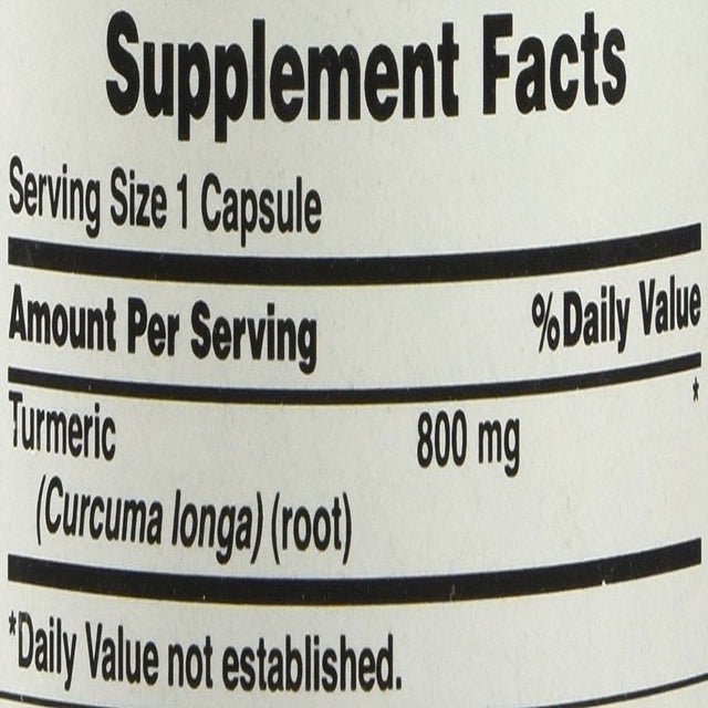 Contains antioxidants, which help cells fight damaging free radicals in the body* Supports overall wellness and a healthy lifestyle* Contains a 50-day supply of easy-to-swallow capsules; capsules can also be opened and prepared as a tea Supplement Facts Serving Size 1 Capsule Amount Per Serving % Daily Value Turmeric 800 mg * (Curcuma longa) (root) *Daily Value not established. Directions: For adults, take one (1) capsule two times daily, preferably with meals. Capsules may be opened and prepared as a tea. Other Ingredients: Gelatin. Contains <2% of: Silica, Vegetable Cellulose, Vegetable Magnesium Stearate. WARNING: If you are pregnant, nursing, taking any medications or have any medical condition, consult your doctor before use. Discontinue use and consult your doctor if any adverse reactions occur. Keep out of reach of children. Store at room temperature. Do not use if seal under cap is broken or missing. No Artificial Color, Flavor or Sweetener, No Preservatives, No Sugar, No Starch, No Milk, No Lactose, No Soy, No Gluten, No Wheat, No Yeast, No Fish. Sodium Free.