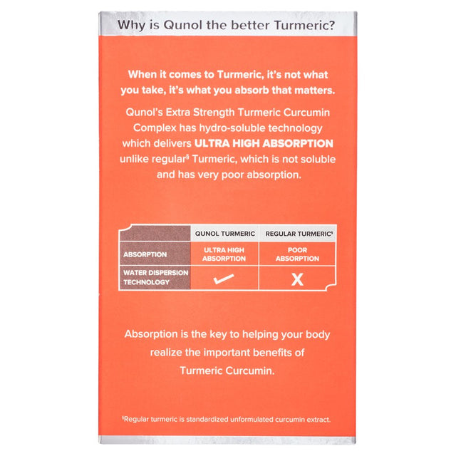 Why is Qunol the better choice? When it comes to Turmeric, it's not what you take, it's what you absorb that matters. Qunol Extra Strength Turmeric Supplement is designed with our Patented Hydro-Soluble Technology to provide you and your body the benefits needed.