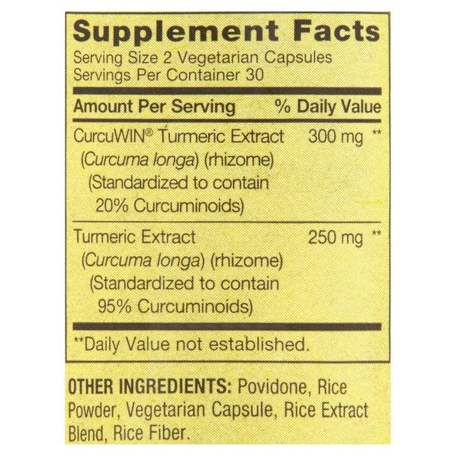 | Features | Supports general wellness, Superior bioavailability, Standardized Turmeric Curcumin complex with CurcuWIN®, 500mg CurcuWIN® turmeric extract per serving, 50mg Turmeric powder per serving, 60 vegetarian capsules per container, Up to 46x greater absorption vs standard Turmeric Curcumin extract, Tamper-evident bottle |