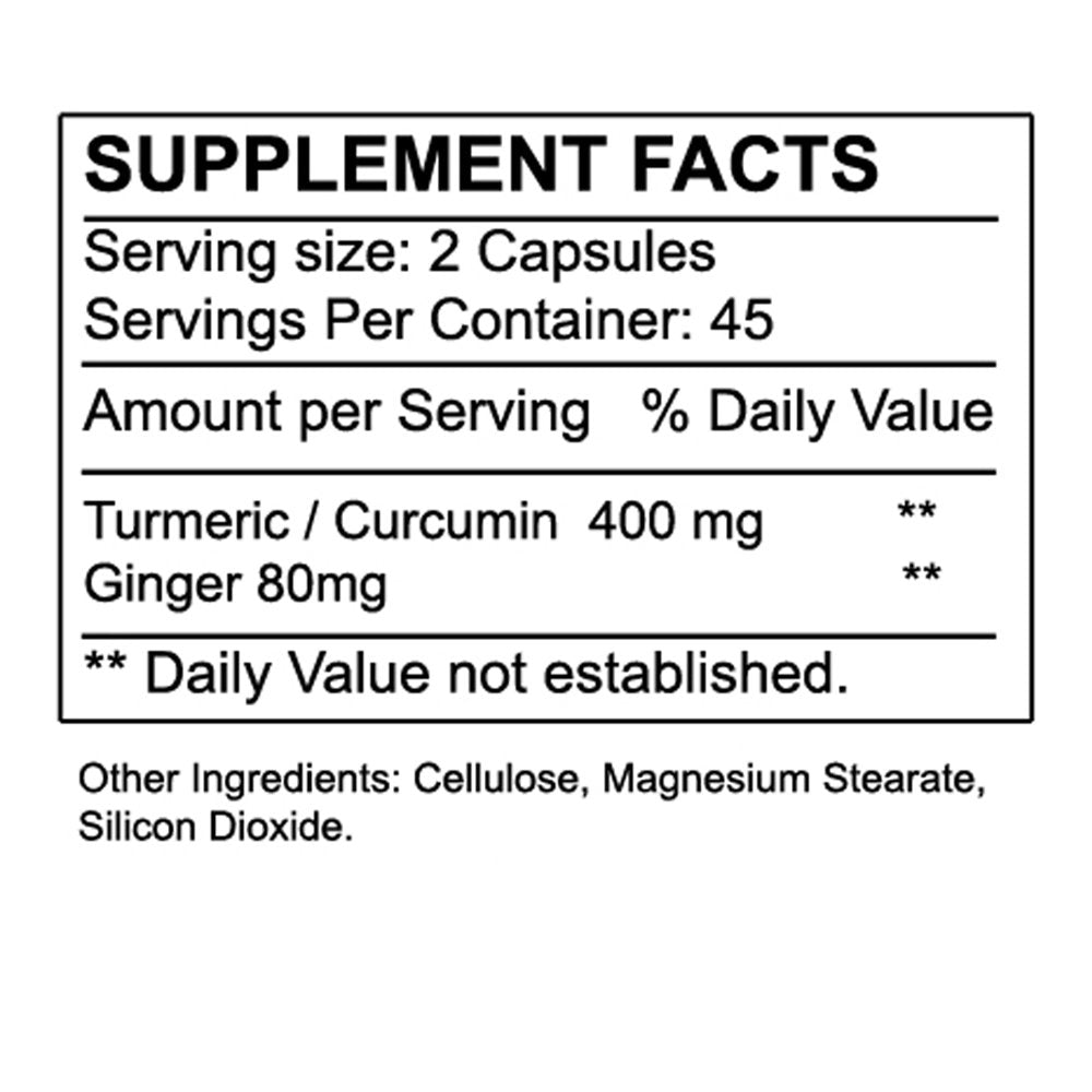 - Potent Ingredients: Each serving of our Turmeric and Ginger dietary supplements contains 400mg of Turmeric Curcumin and 80mg of ginger, ensuring a natural and effective anti-inflammatory support.