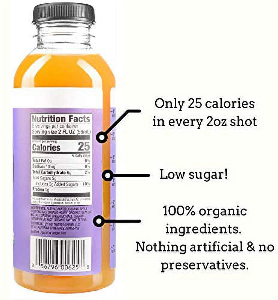 - HOW TO USE: Drink 2oz to start every day. Tastes best cold. Every 2oz shot contains the daily recommended dose of 1.5 tablespoons of Organic, Unfiltered ACV with the mother. We added Turmeric, Ginger, Cinnamon & Cayenne to give our Shots a TON of additional health benefits, too. This is the only Shot you need to take for your daily dose of healthy nutrients!