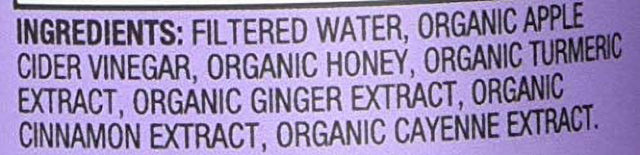 - 100% USDA CERTIFIED ORGANIC INGREDIENTS: Apple Cider Vinegar (unfiltered, with the mother), Turmeric, Ginger, Cinnamon, Cayenne, Honey & filtered water. That's it!