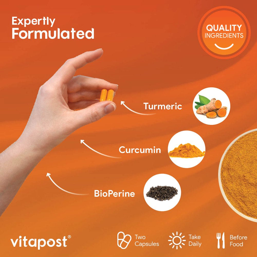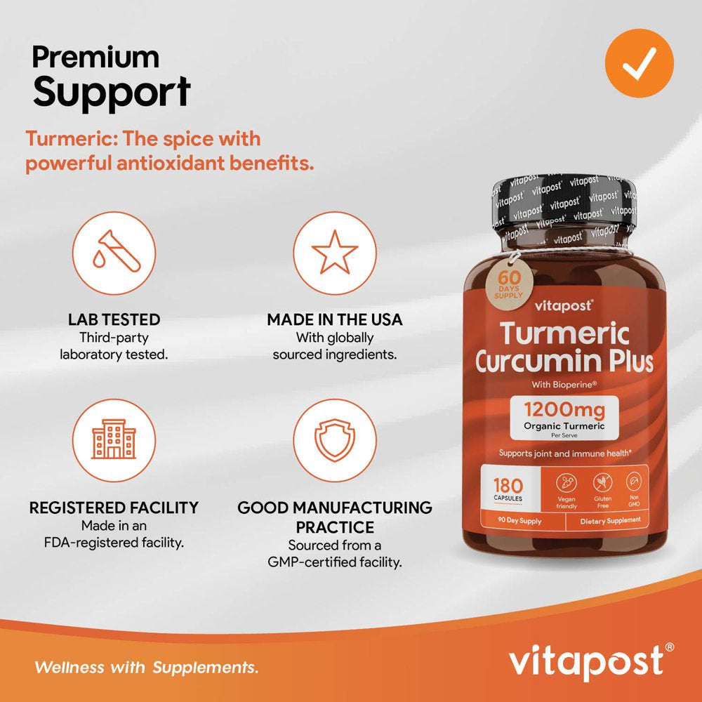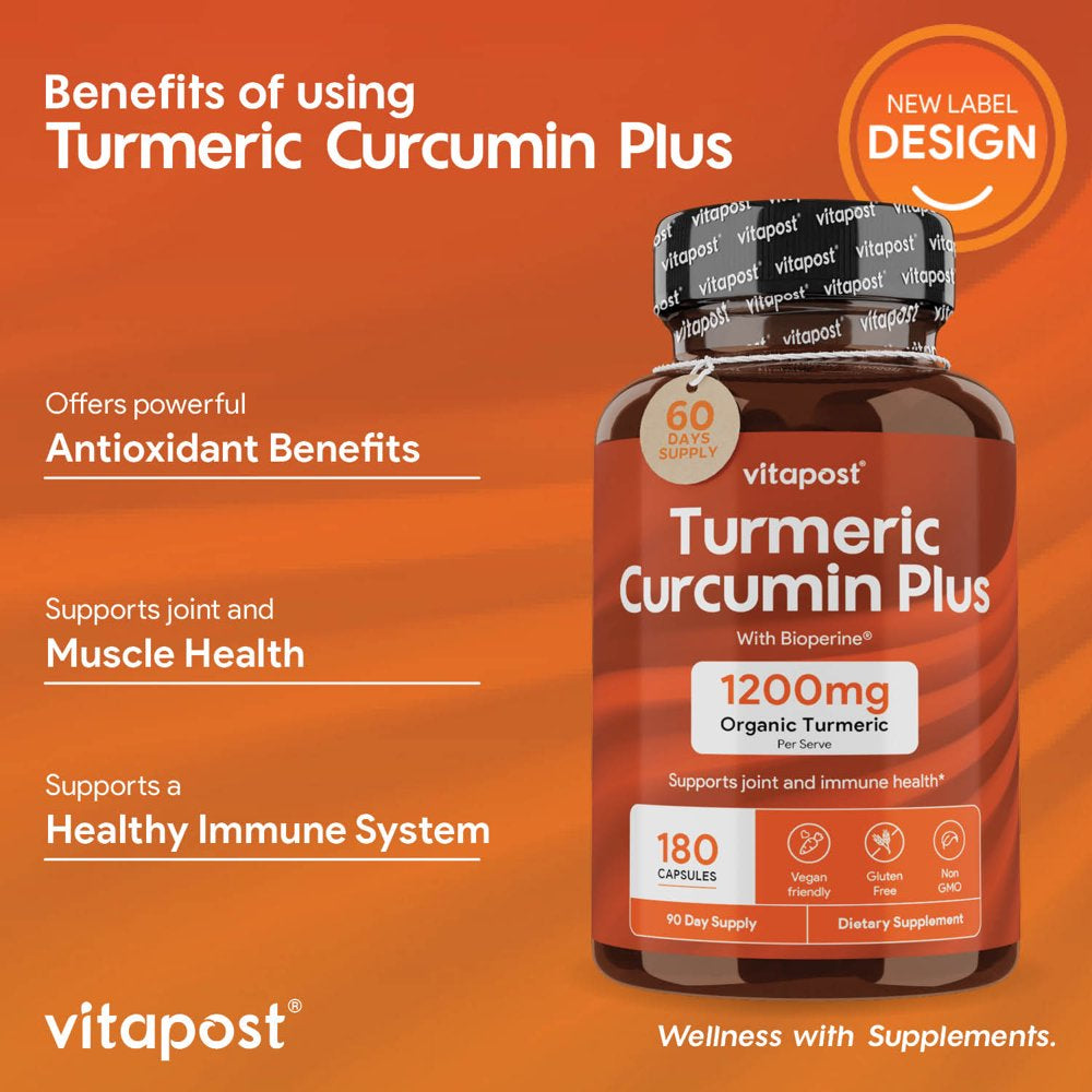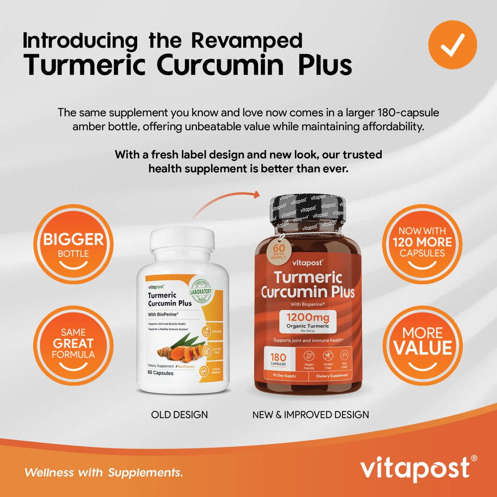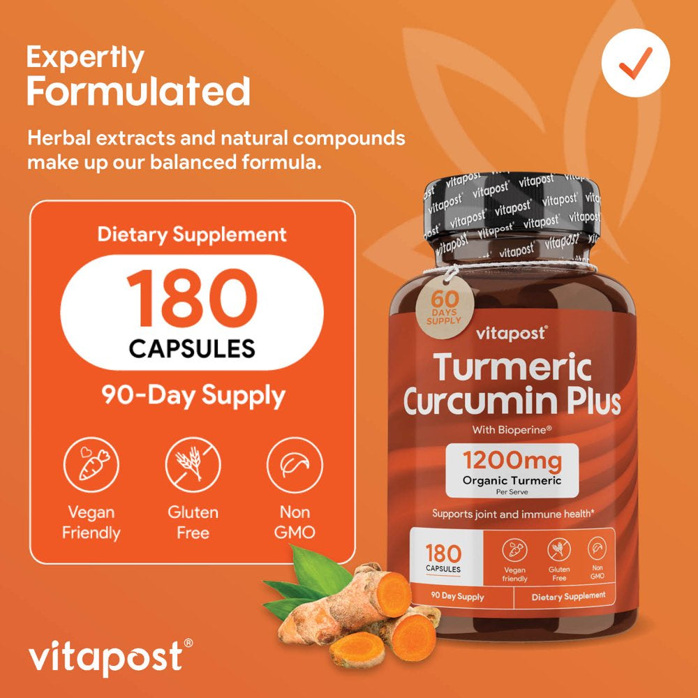 Vitapost Turmeric Curcumin plus Supplement for Joint, Muscle, Immune System Support - 180 Capsules