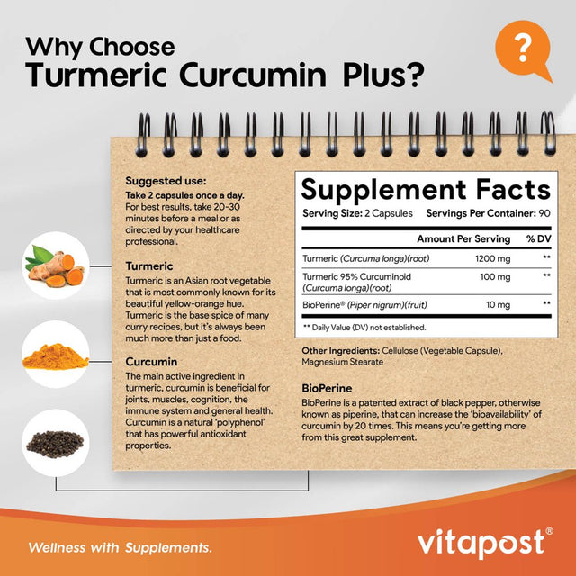 VitaPost Turmeric Curcumin Plus is a high-quality supplement that can support general health, joints, muscles, the brain and other vital organs. It also offers antioxidant support.