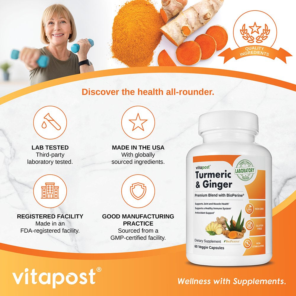 - VitaPost Turmeric & Ginger is made in an FDA-registered, GMP-certified facility and is third-party tested so you can be sure of its content and quality.