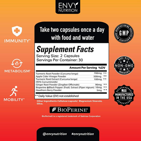 Envy Nutrition Turmeric Ginger Apple Cider Vinegar Pill Capsules with Bioperine, 60 Count