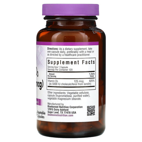 Bluebonnet Nutrition - Vitamin D3 5000 IU - 120 Vegetarian Capsules