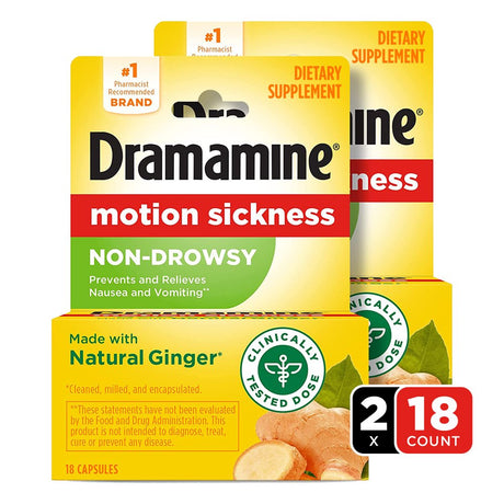 Dramamine Non-Drowsy, Motion Sickness Relief, Made with Natural Ginger, 18 Count, 2 Pack