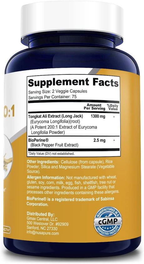 Nusapure Longjack Tongkat Ali 260,000Mg 150 Veggie Caps (Non-Gmo, Gluten Free) Bioperine