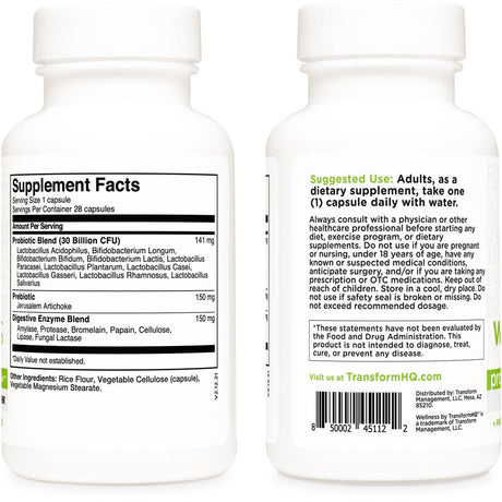 Transformhq Probiotic (>10 Billion CFU) with Prebiotic + Digestive Enzymes Supplement, 28 Capsules