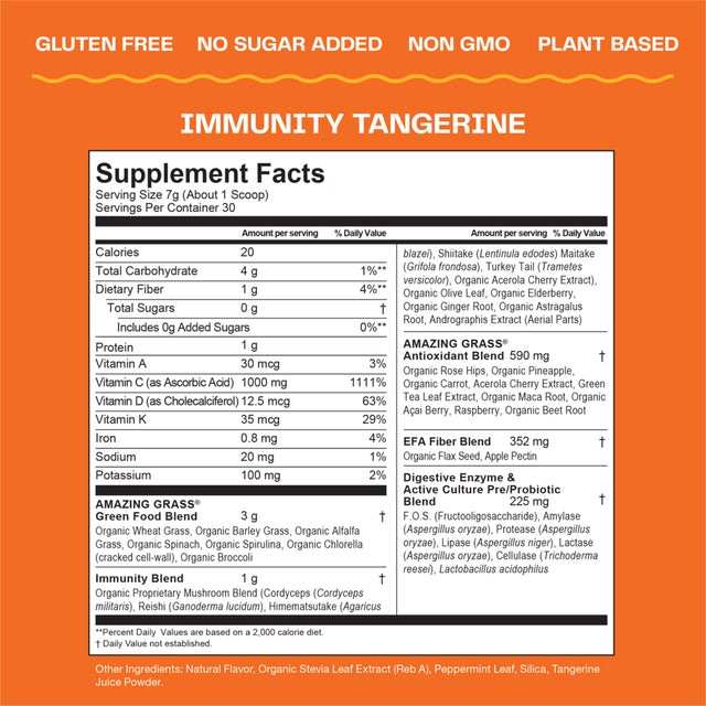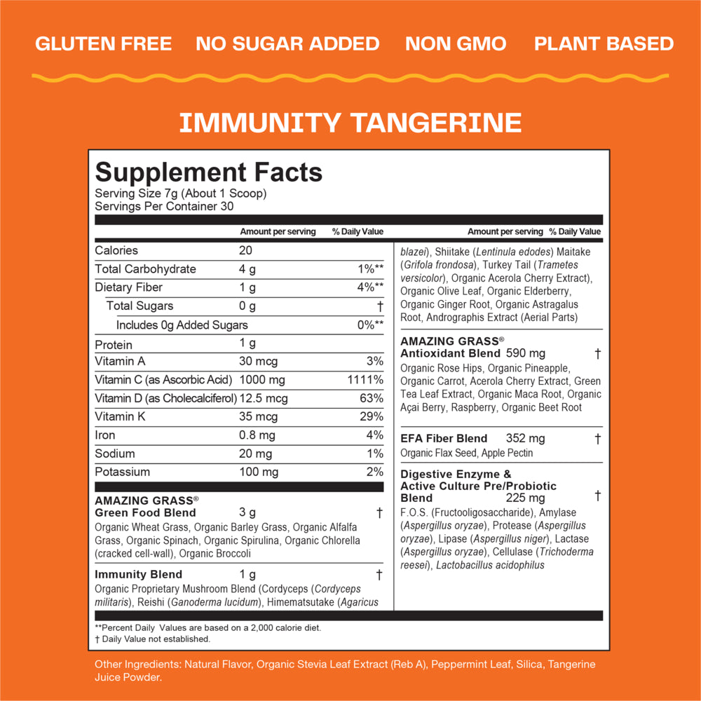• Amazing Grass, Greens Blend Immunity, Drink Powder Mix, Tangerine, 7.4 oz, 30 Servings