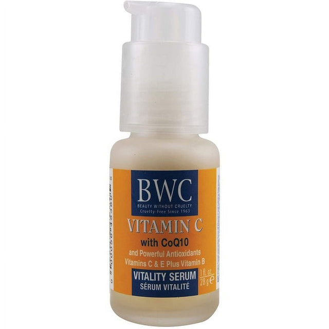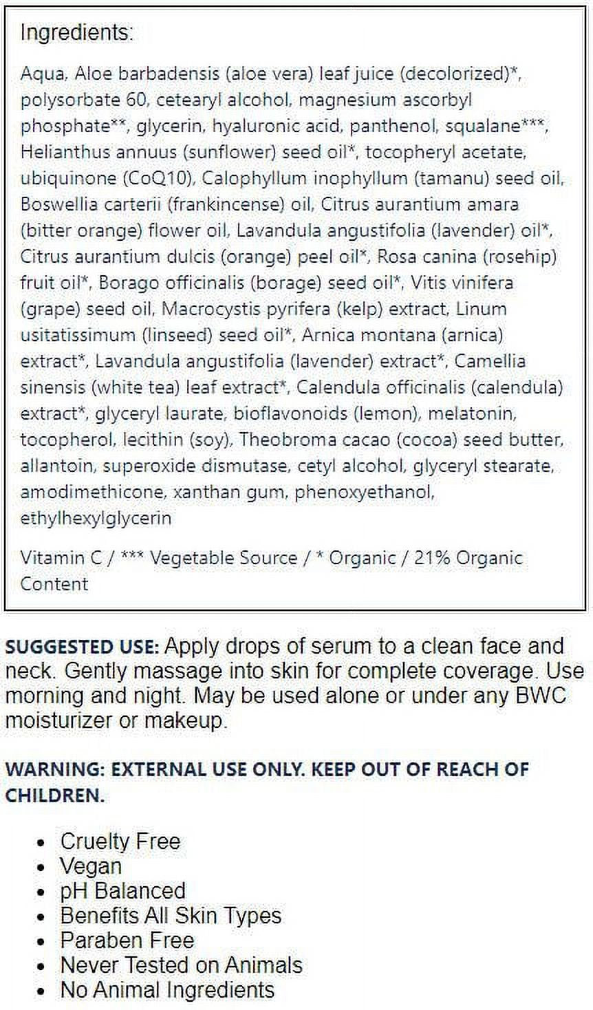 BWC Vitamin C with CoQ10 Organic Vitality Serum uses active forms of vitamin C and Co Q10 to improve skin circulation, clarity, tone and texture. With regular use, anti-oxidants vitamins C, E and A combined with green tea and grape seed extracts help neutralize sun and environmental damage to keep skin youthful. Powerful humectants moisturize skin to smooth and soften. Vital botanicals and organic, aroma-therapeutic essential oils nurture and condition while rich emollients soothe and protect.