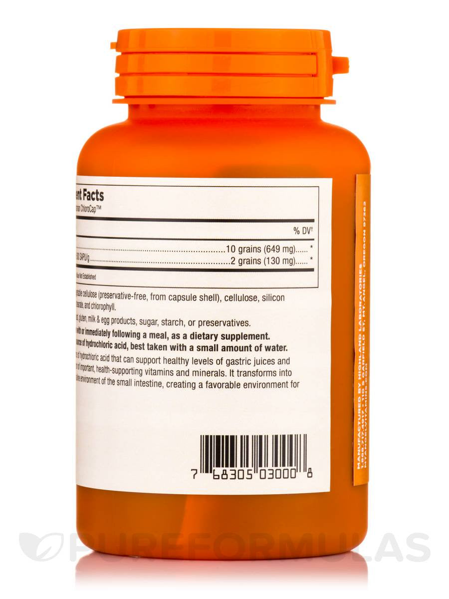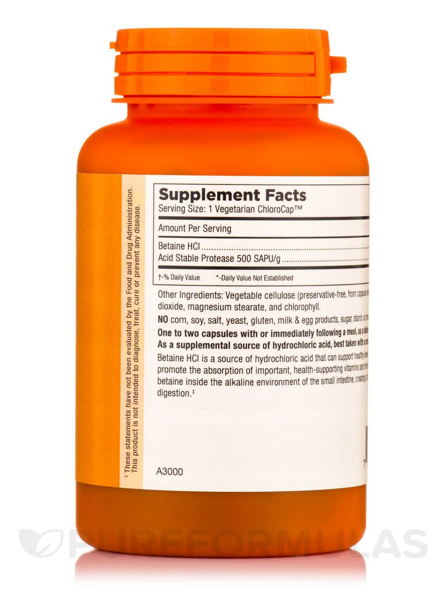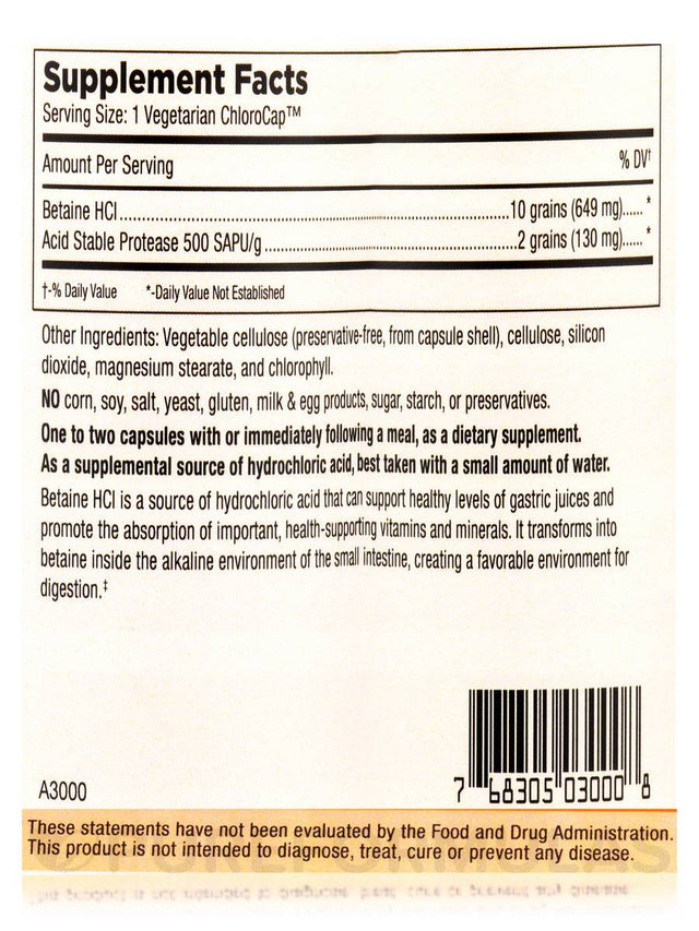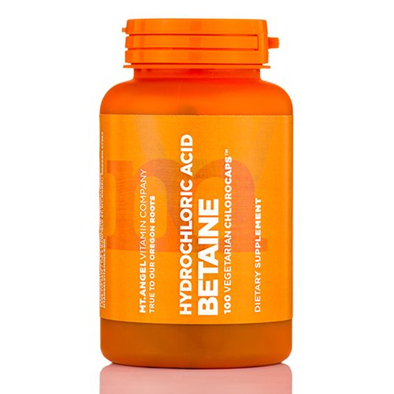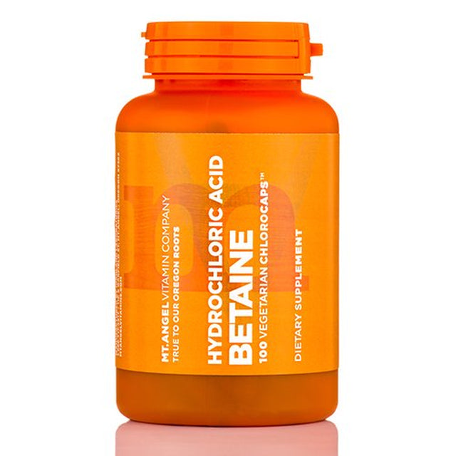Betaine HCl by Mt. Angel Vitamins 100 Capsule Betaine HCl 100 Capsule Betaine HCl is a source of hydrochloric acid that can support healthy levels of gastric juices which are necessary for the absorption of nutrients. Adequate digestive juices are also essential for maintaining health-promoting intestinal bacteria. This formula includes the enzyme acid stable protease to support digestion of proteins. Suggested Use As a dietary supplement One to two capsules with or immediately following a meal as a dietary supplement. As a supplemental source of hydrochloric acid best taken with a small amount of water. - Or as directed by your healthcare professional. Supplement Facts Serving Size 1 Vegetarian ChloroCap Servings Per Container 100 Amount Per Serving Daily Value Betaine HCl 10 grains (649 mg) Acid Stable Protease 500 SAPU g 2 grains (130 mg) Daily Value Not Established Percent Daily Values are based on a 2 000 calorie diet Other Ingredients Vegetable cellulose (preservative-free from