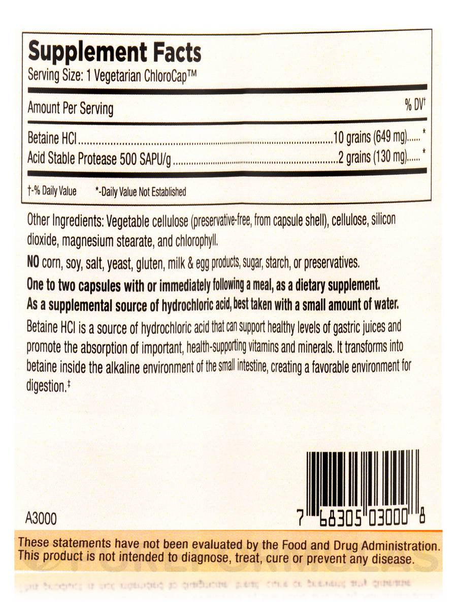 Betaine HCl is a source of hydrochloric acid that can support healthy levels of gastric juices, which are necessary for the absorption of nutrients. Adequate digestive juices are also essential for maintaining health-promoting intestinal bacteria. This formula includes the enzyme acid stable protease to support digestion of proteins.