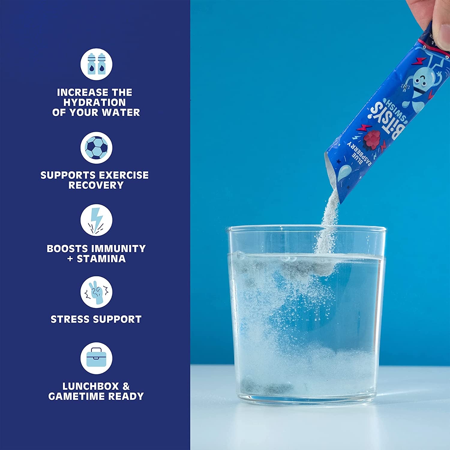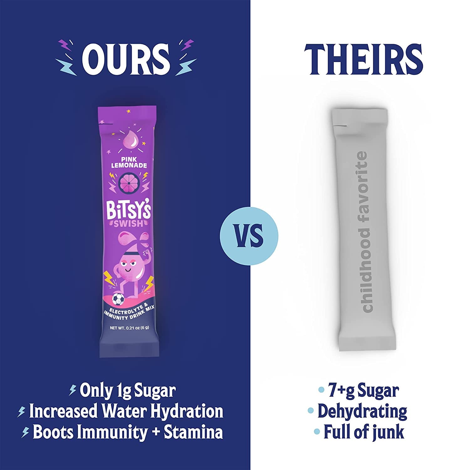 • JUST MIX WITH WATER - SWISH & SIP: Mix 1 electrolytes powder stick pack with 12-16 oz of cold water, shake, and stir well and enjoy. Hydration and Immunity are more important than ever to be mixing into our families' daily lives. Bitsy’s Swish is a kid-ready, energy-filled power-up, packed with a bit more hydration and a bit more immunity.
