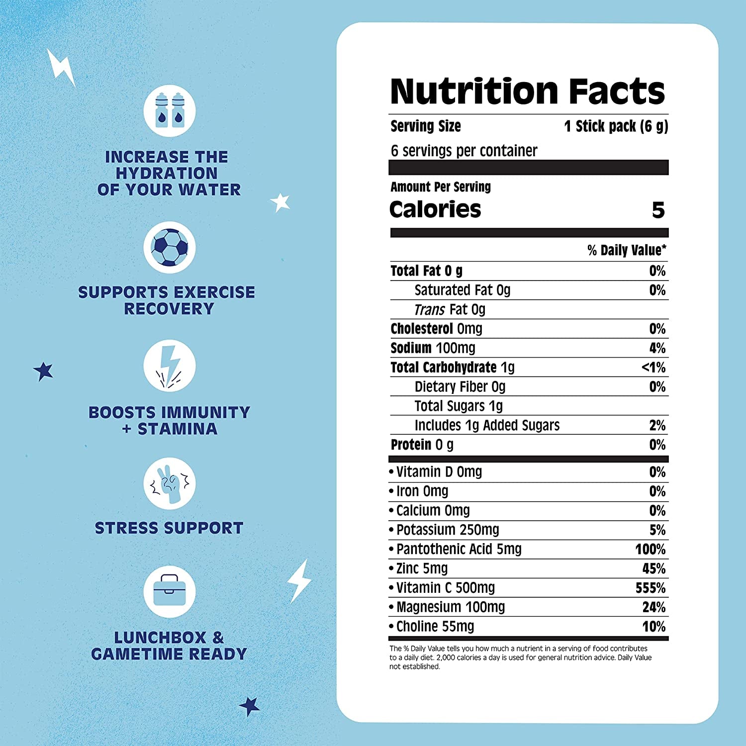 • 1G OF SUGAR PER PACKET: Help your kids reach their daily water intake with our hydration packets that are full of fun flavor without the sugar stress. Packed with hydration and immunity-boosting vitamins like Vitamin C, Vitamin B5, and Zinc.