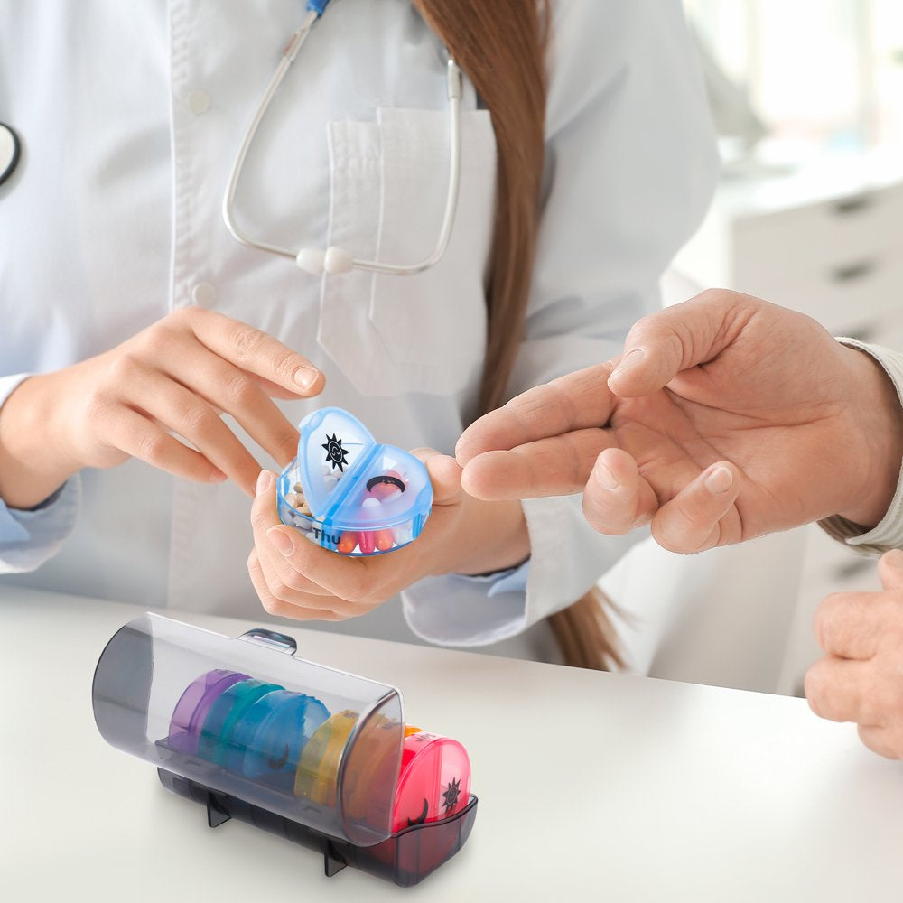 AM/PM split pill compartments make planning daily doses easy. Colored transparent lids and morning/night and day icons help you quickly identify your vitamins, supplements, and medication. Fill once per week and done!