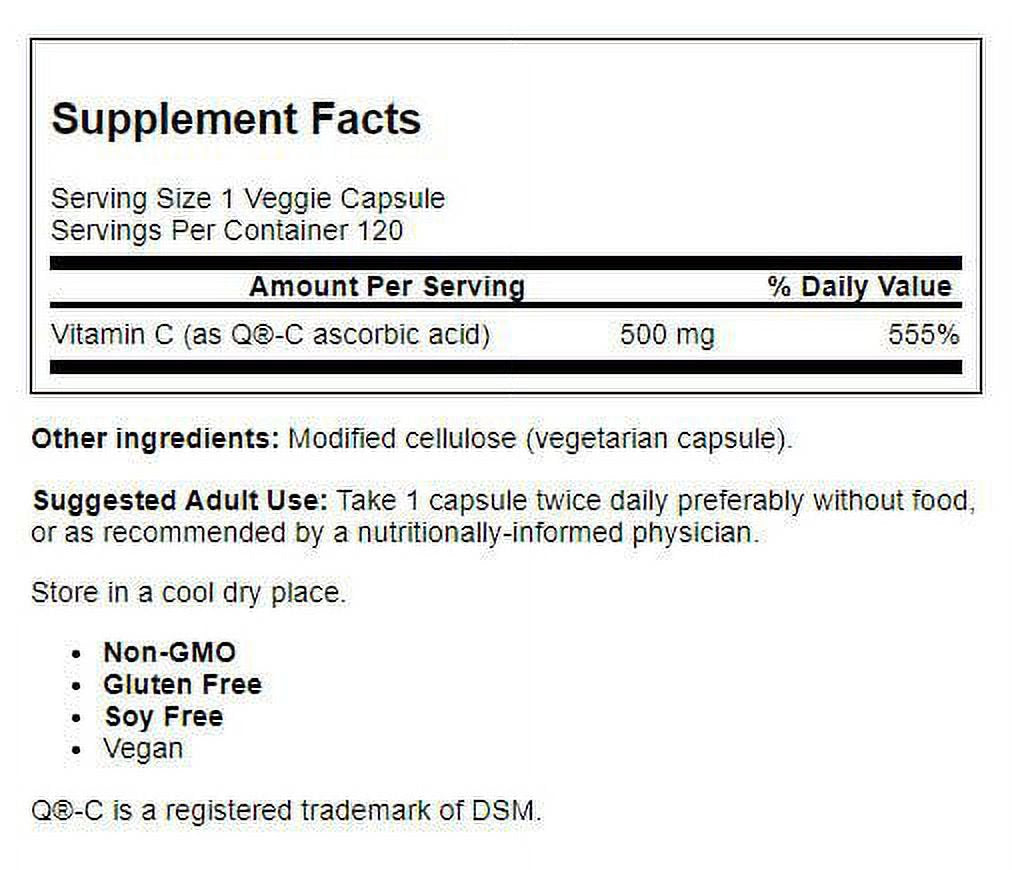 Doctor's Best - Vitamin C with Quali-C 500 mg - 120 Vegetarian Capsules Supplement Facts Serving Size: 1 capsule Servings Per Container: 120 servings Amount Per Serving %DV Vitamin C (as Quaili-C ascorbic acid) 500 mg 833% † Daily Value not established. Other Ingredients: Modified cellulose (vegetarian capsule)/div>