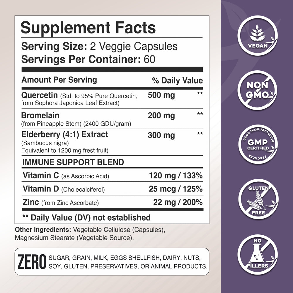 - THE KEY BENEFITS:*Quercetin with bromelain + Black Elderberry supports healthy aging, cardiovascular health, helps to reduce the damage and irritation caused by free radicals, helps promote a normal respiratory function, helps to fuel the immune system, helps enhance the absorption of zinc.* Quercetin + bromelain, two plant extracts that have been shown to support the immune system and the body’s natural inflammatory response upon exposure to environmental challenges.*