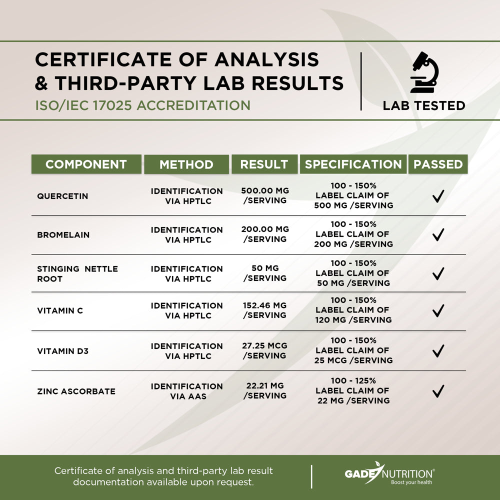 - A POTENT COMBINATION TO BOOST THE IMMUNE SYSTEM.* Quercetin Supplements by Gade Nutrition is made with the finest ingredients including a proprietary blend of Quercetin, Bromelain, Stinging Nettle, Vitamin C, D and Zinc. Quercetin is a flavonoid (plant pigment) naturally found in fruits and vegetables. It is found in many foods, such as red wine, onions, green tea, apples, berries, and more. It is known for its Anti-oxidant and Anti-Inflammatory Properties.*