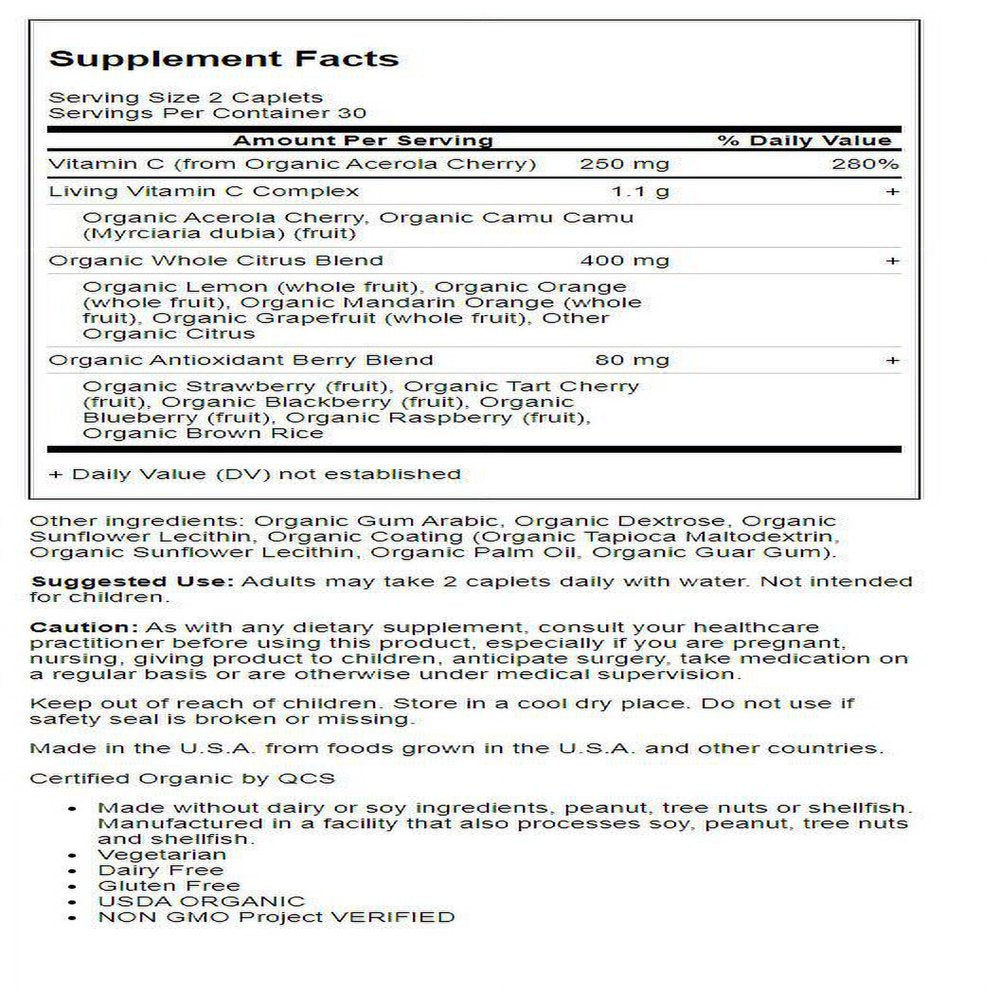 Living Vitamin C, Caplets 90 caplets Full spectrum vitamin C formula with homeostatic nutrient complexes. Whole food dietary supplement. 100% Vegetarian. This product is made with natural ingredients, therefore color may vary from lot to lot. Contains no artificial colors or preservatives. Homeostatic nutrients are vitamins and minerals present in the substrate fermented by select probiotic organisms. Homeostatic Nutrient Complex vitamins and minerals, unlike isolated vitamins and minerals, are complexed and enriched with an array of by-products and metabolites of beneficial microorganisms. Adults take 3 caplets with meals each day. Consult a physician before exceeding 3 caplets per day. May be taken with or without food. Store in a cool, dry place. As with any dietary supplement, consult your healthcare practitioner before using this product, especially if you are pregnant, nursing or under medical supervision. 90 caplets West Palm Beach, FL 33407 2003 Garden of Life