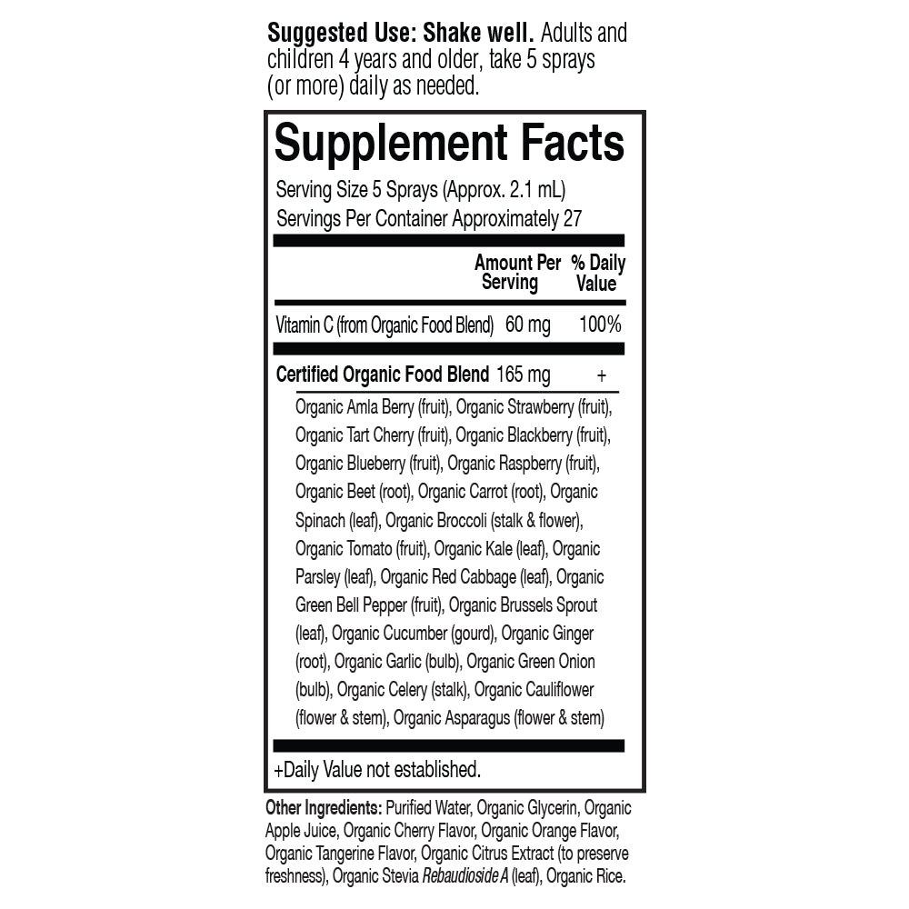 Developing a multi and targeted nutrients that are Certified USDA Organic, Non-GMO Project Verified, made from nothing but real, whole foods is incredibly difficult?which is likely why it had never been done before. For us, it took years of innovation and patience. Our extended family of organic farmers provides the fresh fruits, vegetables and herbs that make up mykind Organics? personalized, whole food formulas. Each tablet or spray provides clean, whole food nutrition. In addition, mykind Organics is the first to utilize Clean Tablet Technology, our patent-pending process that uses only organic, whole food ingredients. mykind Organics Certified Organic Whole Food Vitamin C (Organic Spray) is designed to deliver Certified USDA Organic, Non-GMO Project Verified Vitamin C from real food in an easy-to-use liquid form. A daily dose of five sprays provides 100% of the daily value of vitamin C without any artificial ingredients or chemical preservatives?just wholesome organic food with a delicious cherry-tangerine taste with organic stevia. mykind Organics Vitamin C is a whole food, vitamin C formula that?s both Certified USDA Organic and Non-GMO Project Verified?all in an easy-to-use, great-tasting cherry-tangerine spray. Made from real organic whole foods, including Amla berry and many other vitamin C-packed foods, mykind Organics Vitamin C provides 100% DV in approximately five yummy sprays! Why Amla berry? Organic Amla berry is one of the richest food sources of vitamin C with naturally occurring bioflavonoids and supporting co-nutrients for vitamin C absorption.
