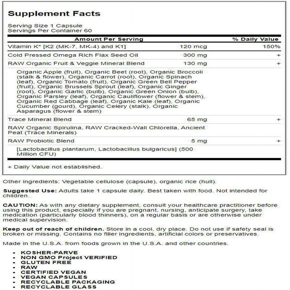 Made with individually grown nutrients utilizing probiotic cultivation to produce RAW Food-Created Nutrients?, Vitamin Code supplements are delivered in a whole food base of fruits and vegetables. Vitamin Code supplements are RAW, which not only means that they are produced below 115º F, but also means that these nutrients come with their natural cofactors, along with live probiotics and enzymes, just like raw foods! Vitamin Code raw powders are delivered in capsules without any binders or fillers?everything you want and nothing you don?t want. Vitamin Code RAW K-Complex is whole food nutrition, specifically formulated to deliver 120mcg of whole food K-Complex, featuring Vitamin K2 as MK-7, along with Vitamins K1 and K2 as MK-4. Fat- soluble Vitamin K is delivered in a whole food base of cold-pressed omega-rich chia and flaxseed oil, which work as a lipid delivery system to promote absorption. The 23 fruits and vegetables plus 75 alkalizing trace minerals add supporting antioxidants, vitamins and nutrient cofactors.